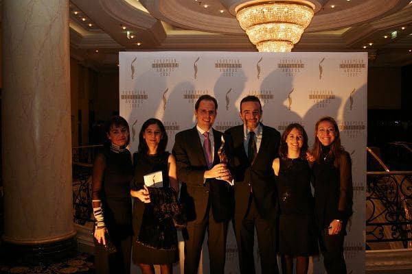 Sechs Personen in eleganter Kleidung posieren vor einer festlichen Kulisse mit einem Kronleuchter.