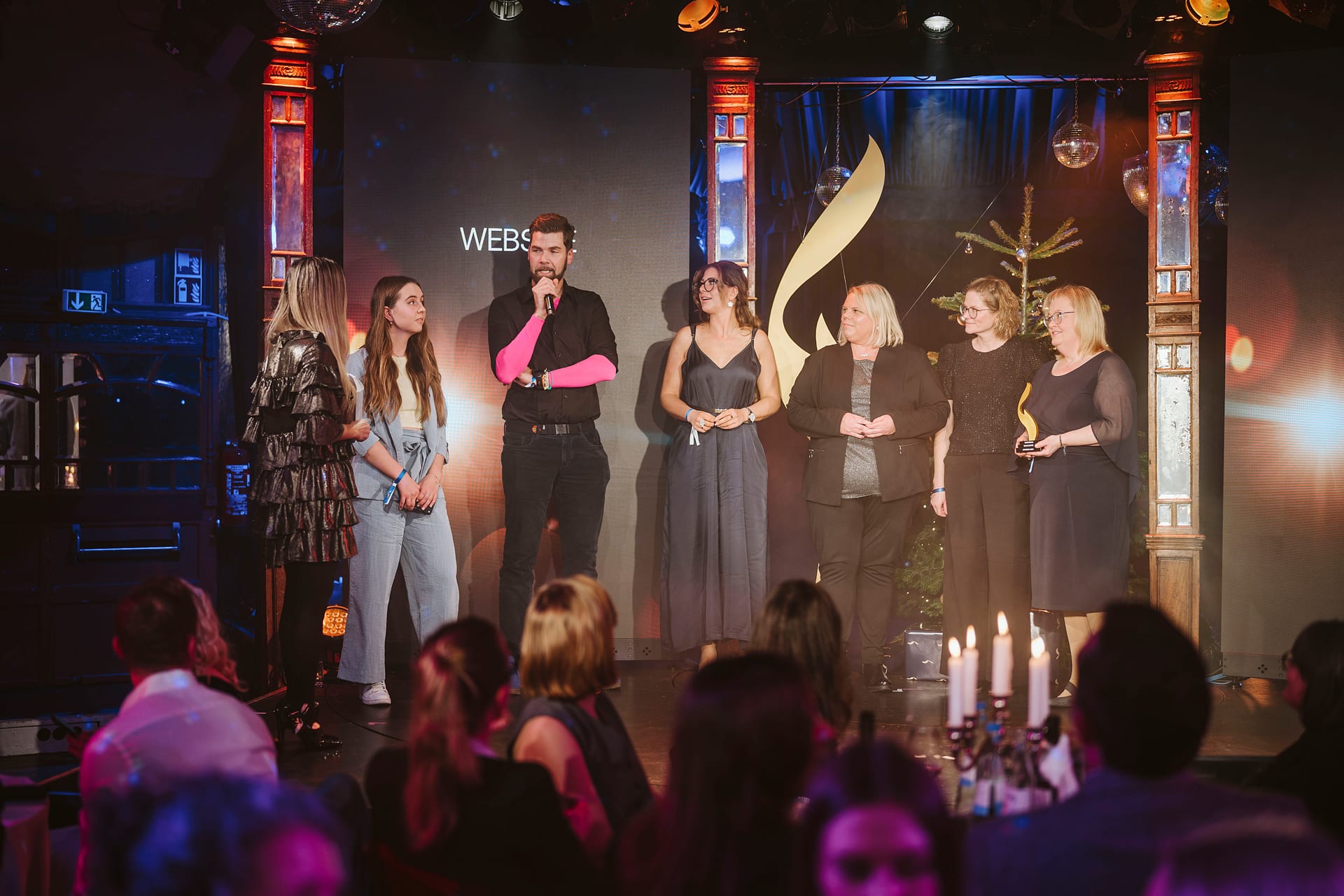 Preisverleihung mit mehreren Personen auf der Bühne, die Auszeichnungen halten, vor festlicher Kulisse.