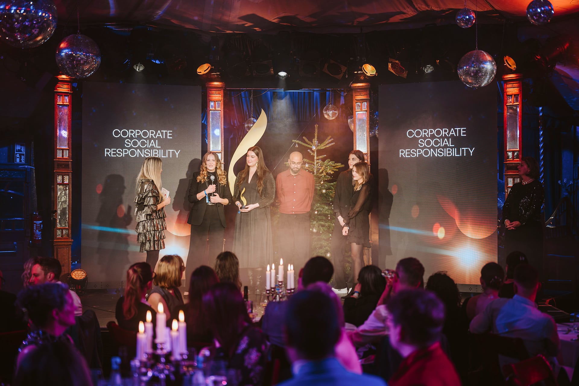 Zwei Frauen und ein Mann nehmen einen Preis auf der Bühne entgegen, umgeben von Gästen und festlicher Dekoration.