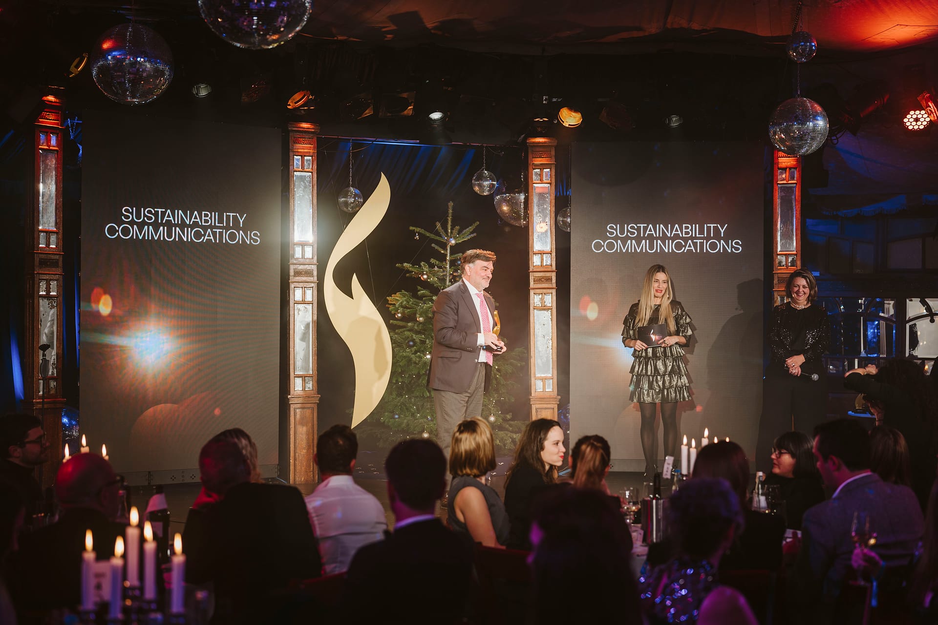 Awardshow mit Rednern auf der Bühne, Publikum im Vordergrund, festliche Dekoration und Lichter im Hintergrund.