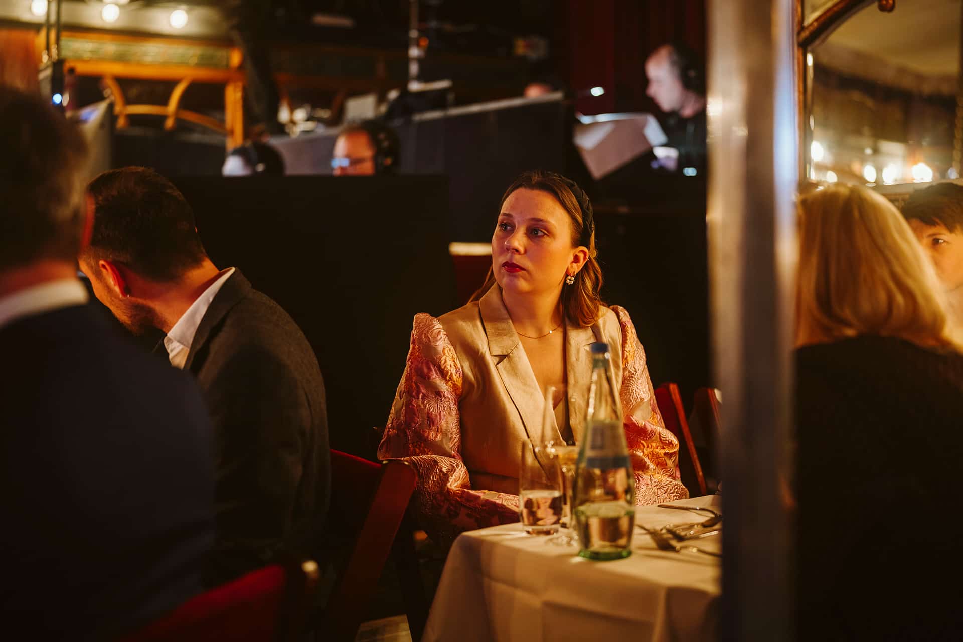 Frau in eleganter Kleidung sitzt an einem Tisch während einer Preisverleihung, im Hintergrund sind weitere Gäste und Tec...