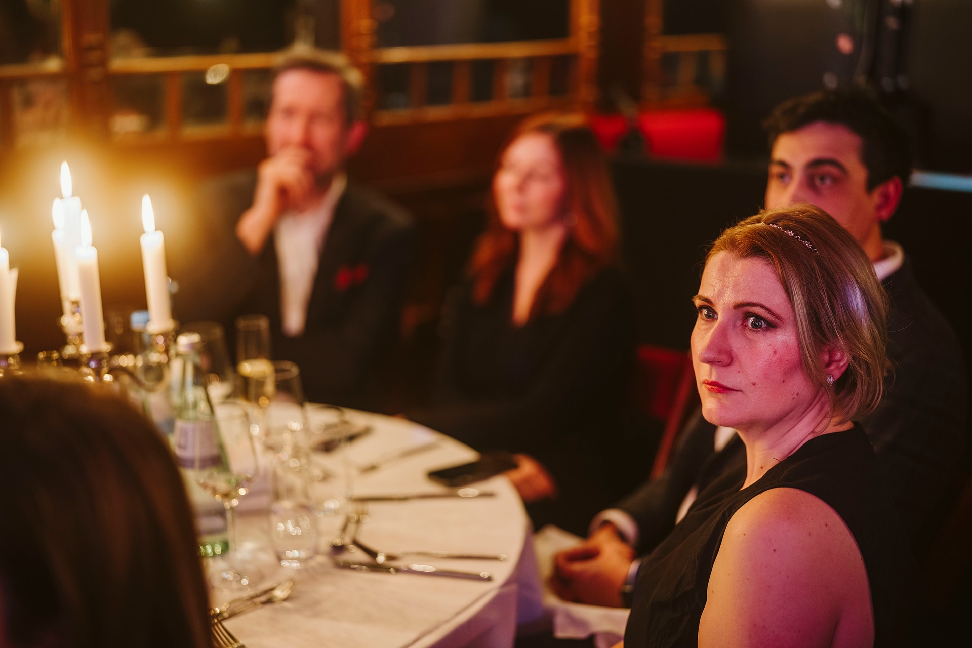 Personen in eleganter Kleidung sitzen an einem Tisch bei einer Preisverleihung, Kerzenlicht und festliche Atmosphäre.