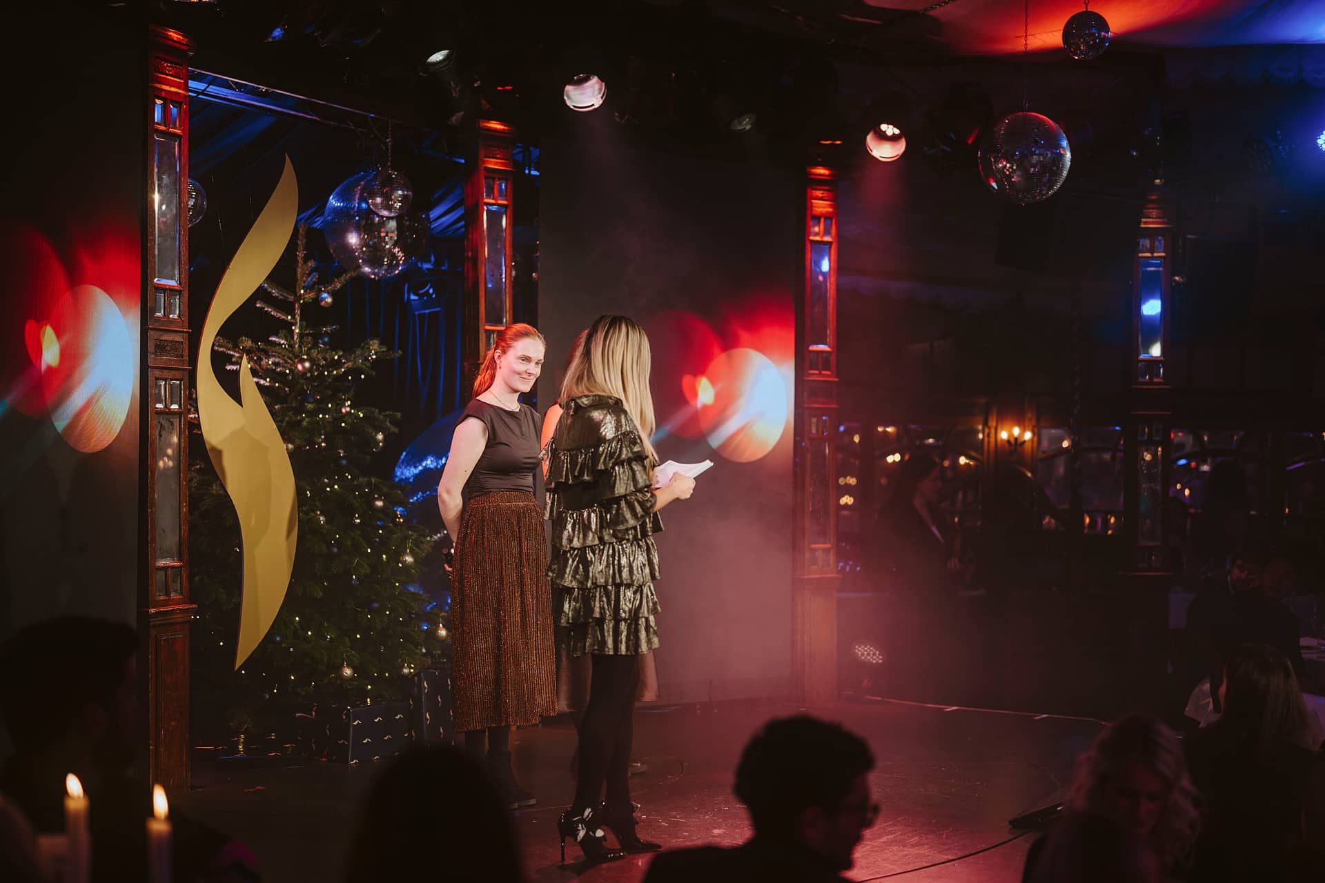 Zwei Frauen auf einer Bühne bei der European Excellence Awards Show, mit Lichtern und einer festlichen Dekoration im Hint...