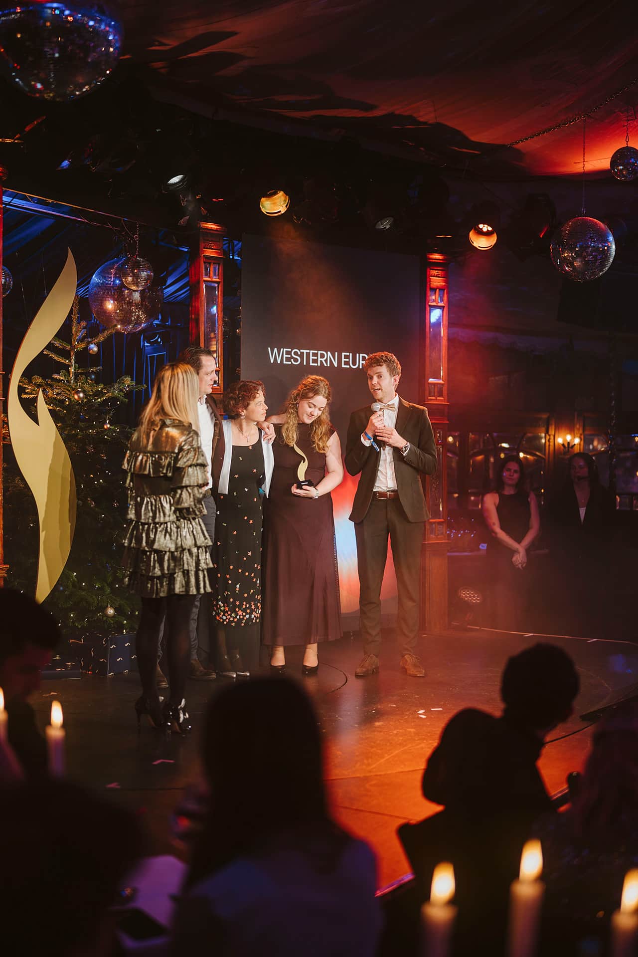 Vier Personen stehen auf einer Bühne bei der European Excellence Awards-Veranstaltung, umgeben von festlicher Dekoration.