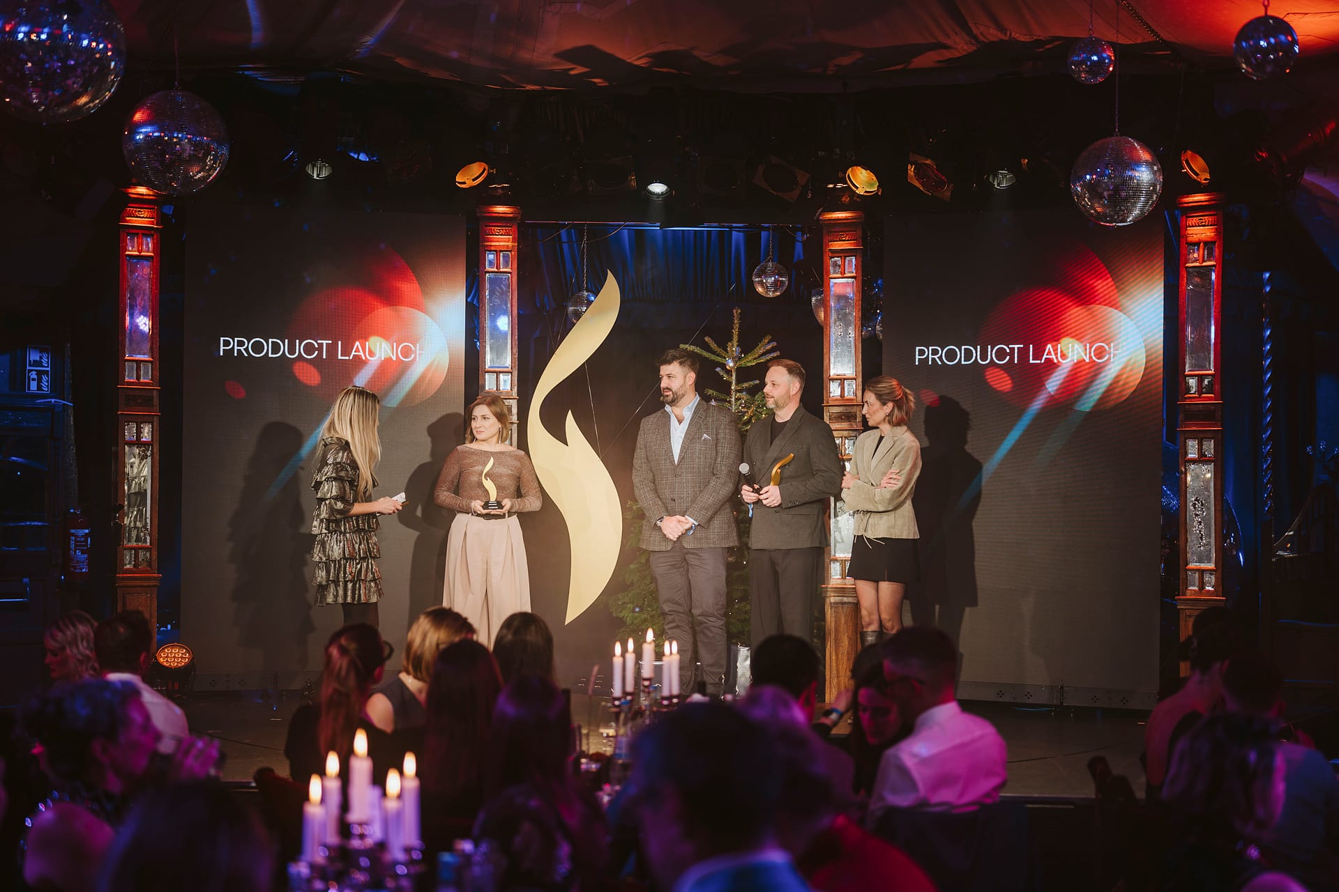 Preisverleihung mit vier Personen auf der Bühne, die Auszeichnungen entgegennehmen, vor festlicher Kulisse und Publikum.