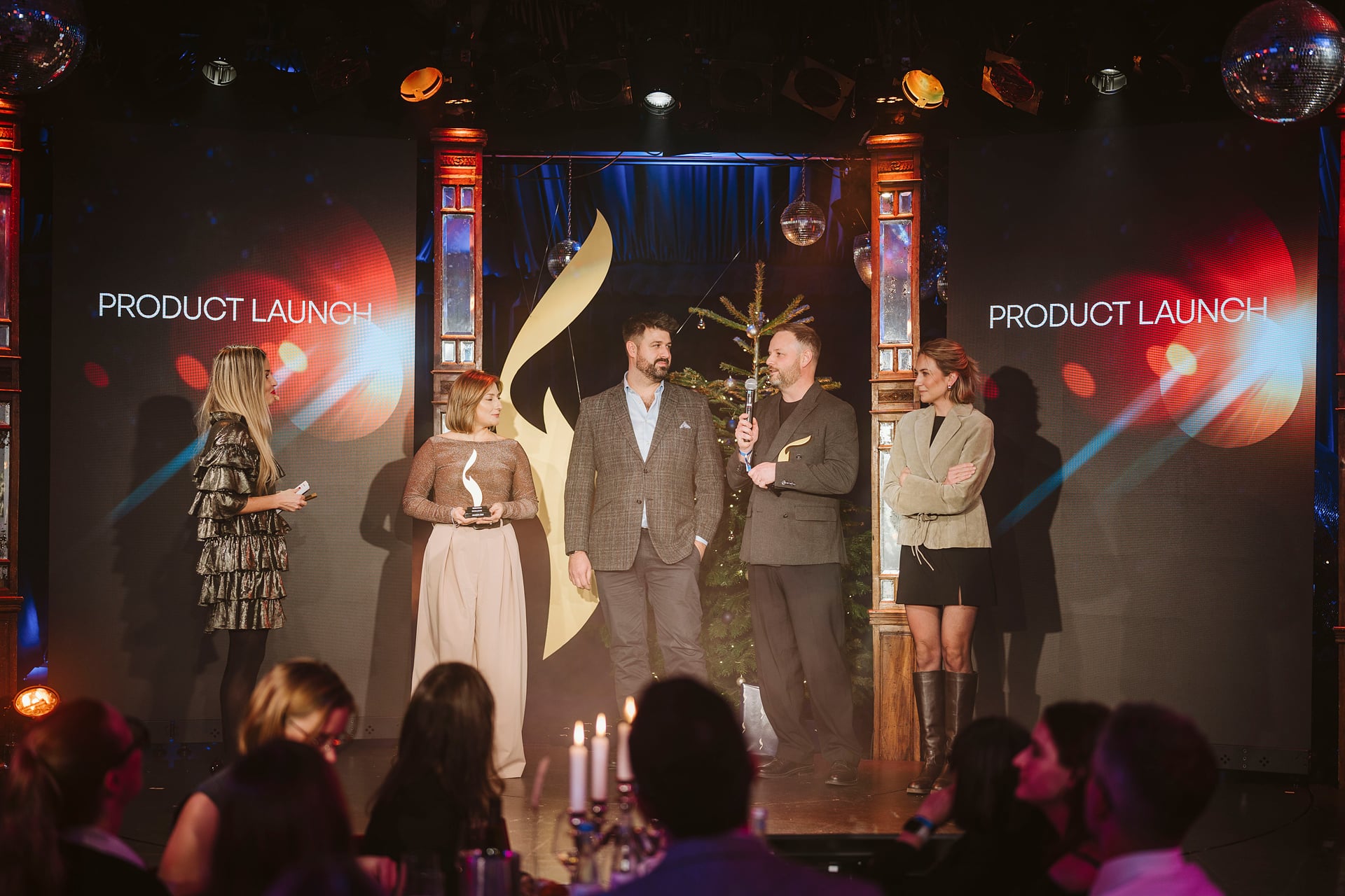 Award-Show mit vier Personen auf der Bühne, die einen Preis präsentieren, im festlichen Ambiente mit Lichtern und Dekora...