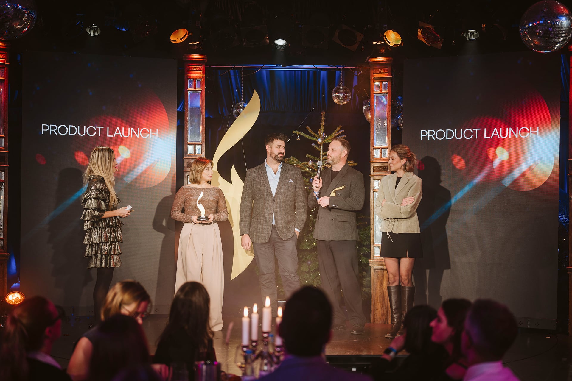 Preisverleihung mit Moderatoren und Gewinnern auf einer Bühne, umgeben von festlicher Beleuchtung und Bildschirmen.