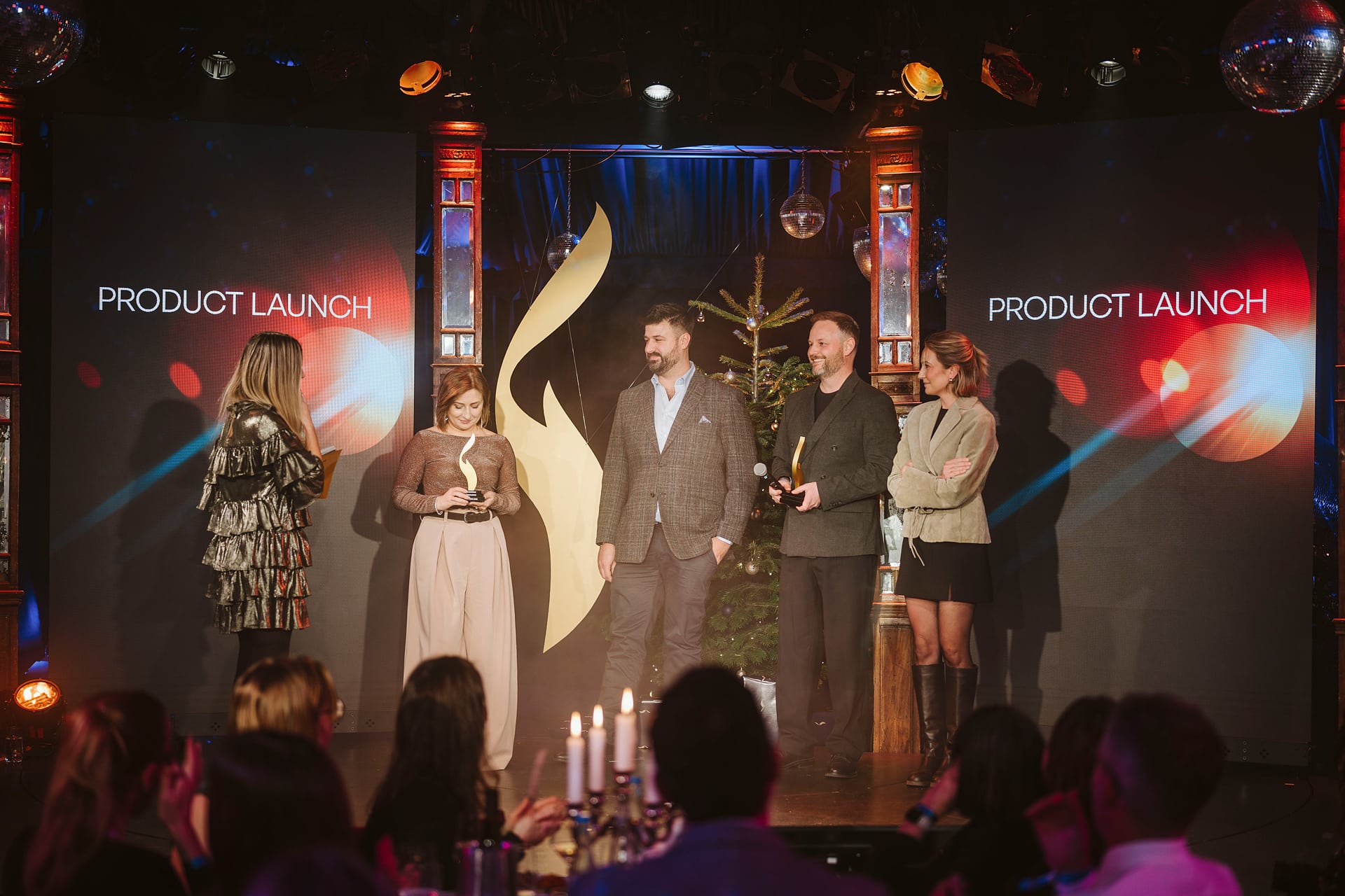 Preisverleihung mit fünf Personen auf der Bühne, umgeben von festlicher Dekoration und Bildschirmen mit "Product Launch".