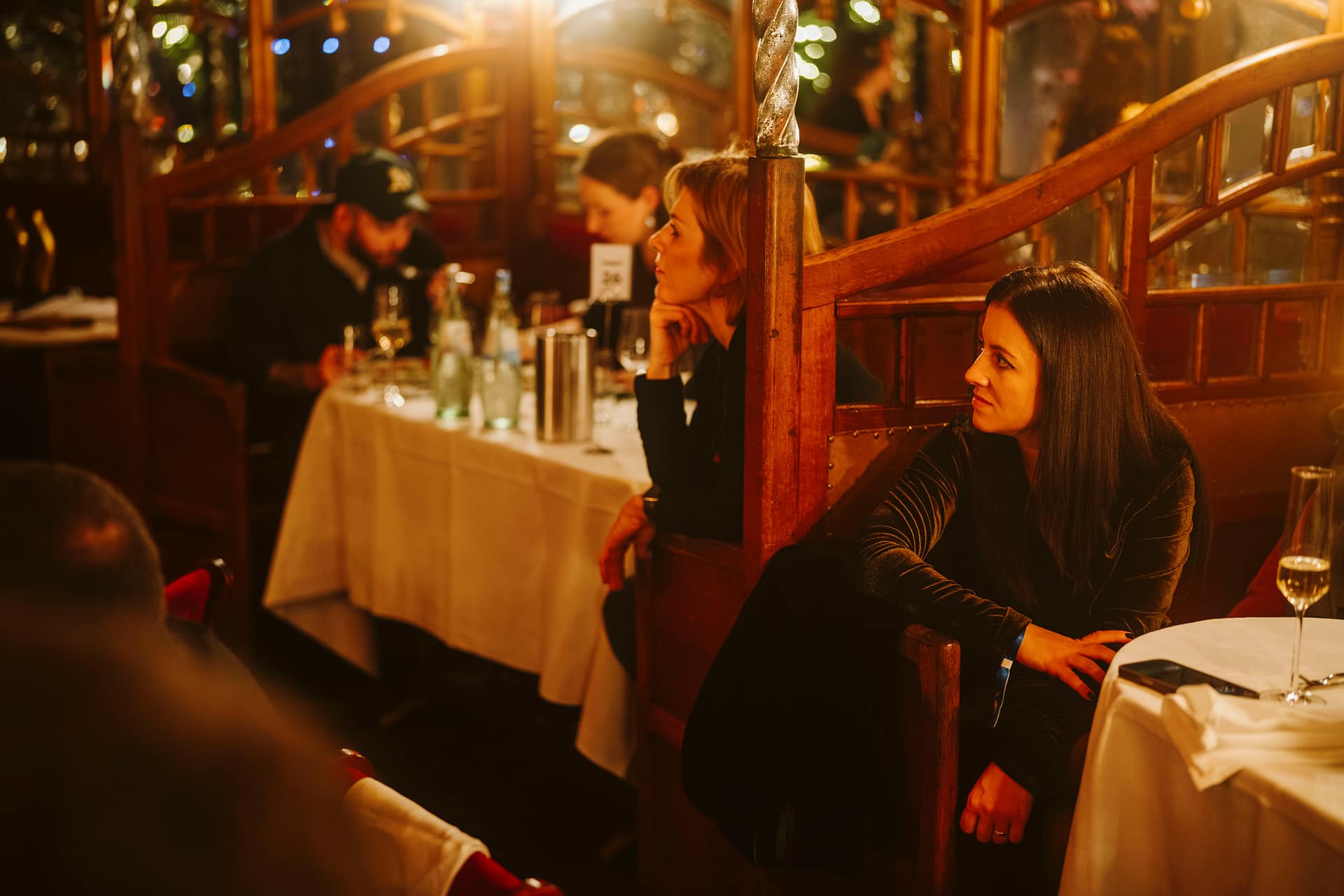 Zwei Frauen sitzen in einem eleganten Restaurant, umgeben von Gästen und festlicher Atmosphäre.