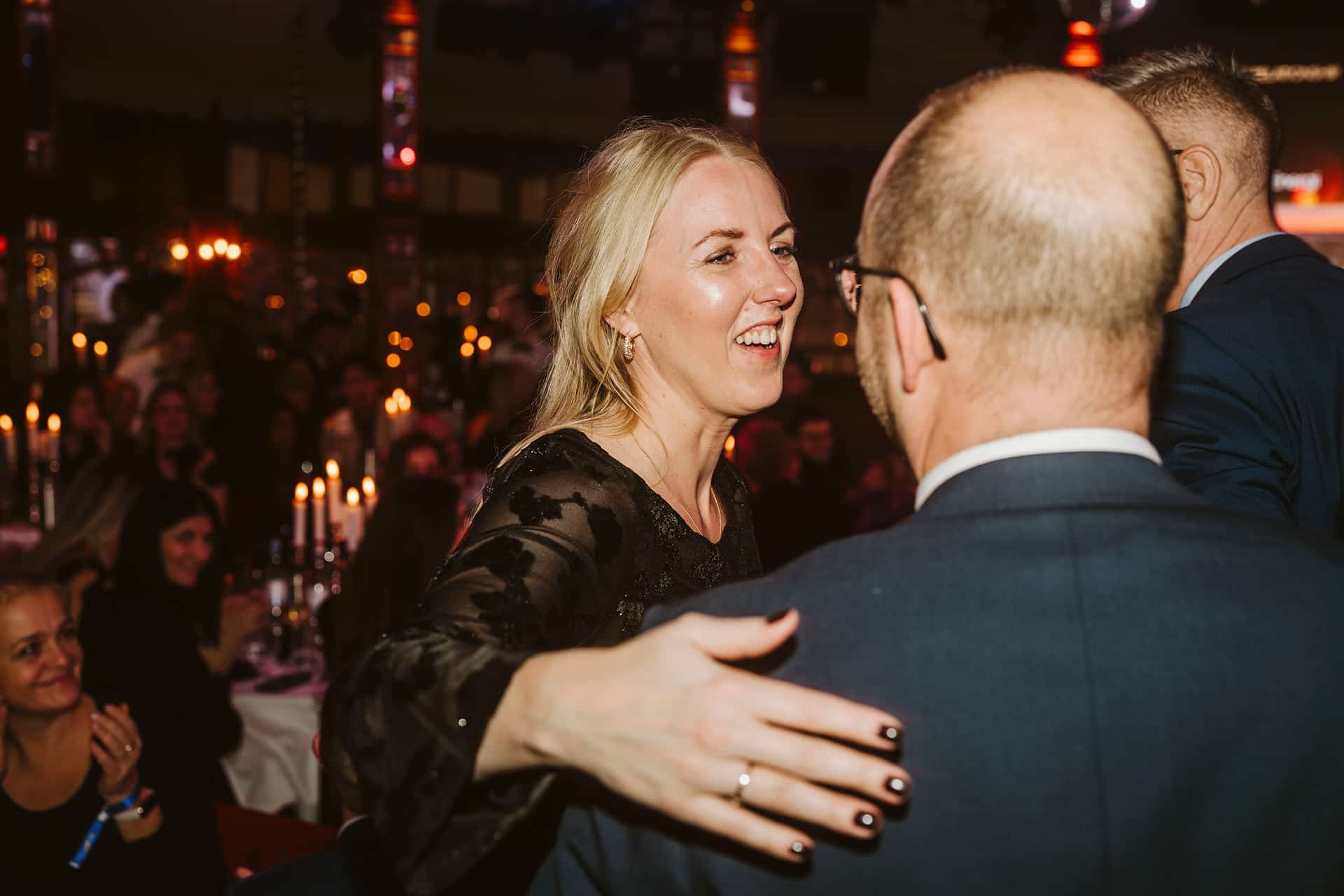 Frau mit blonden Haaren umarmt einen Mann in Anzug bei der European Excellence Awards Veranstaltung.