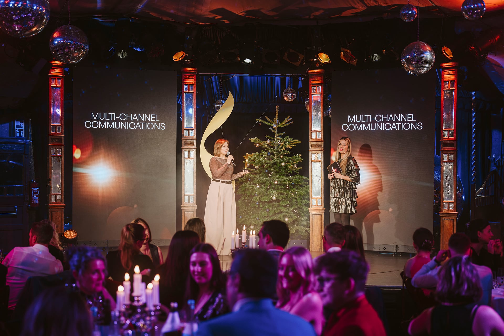 Zwei Frauen auf einer Bühne bei einer Preisverleihung, umgeben von Gästen und festlicher Dekoration.