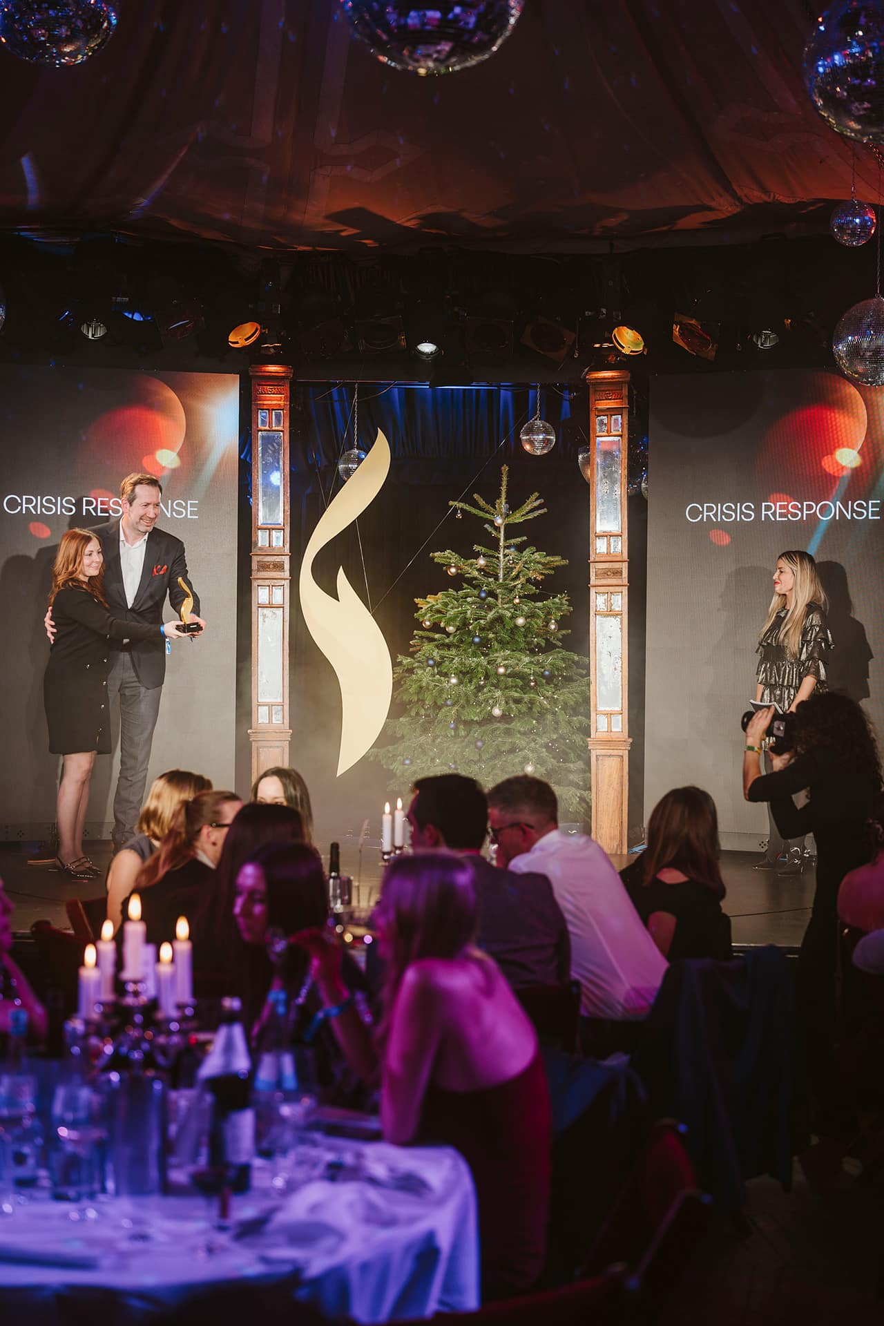 Awardverleihung mit festlich dekorierter Bühne, Tannenbaum und Gästen an Tischen im Vordergrund.