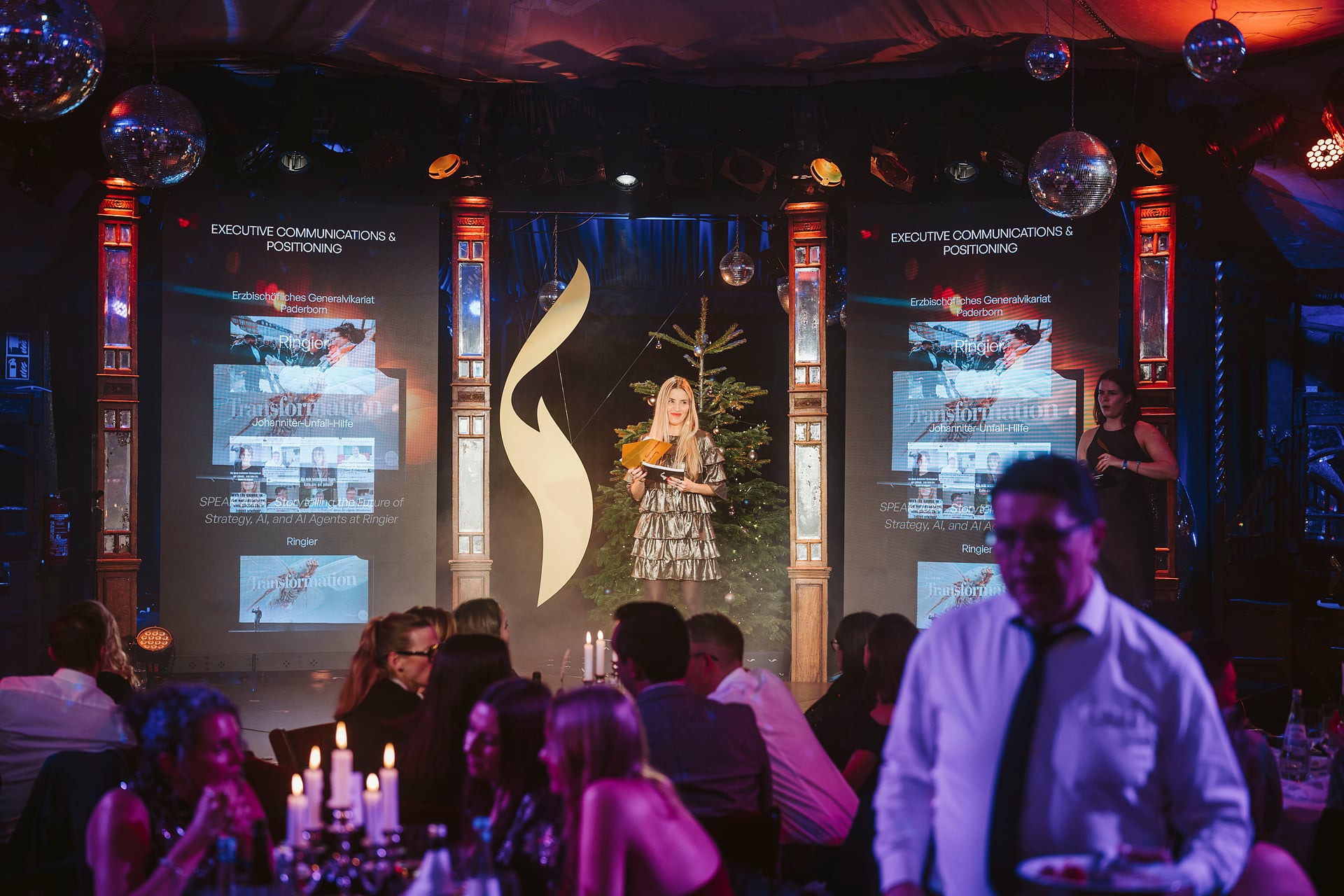 Frau in glitzerndem Kleid hält einen Preis auf einer Bühne, umgeben von festlicher Dekoration und Publikum.
