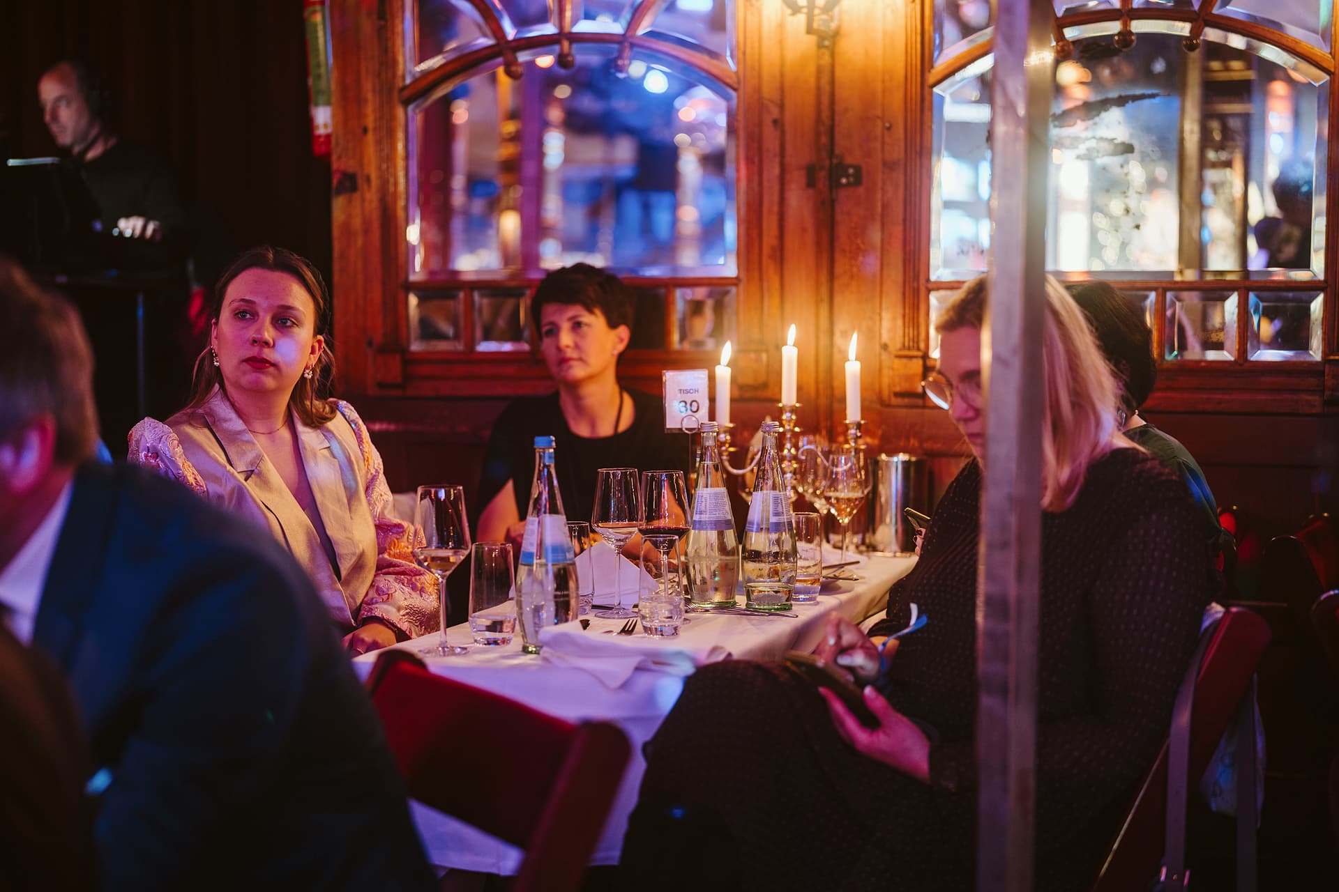 Zwei Frauen sitzen an einem Tisch bei einer Preisverleihung, umgeben von Kerzenlicht und eleganter Dekoration.