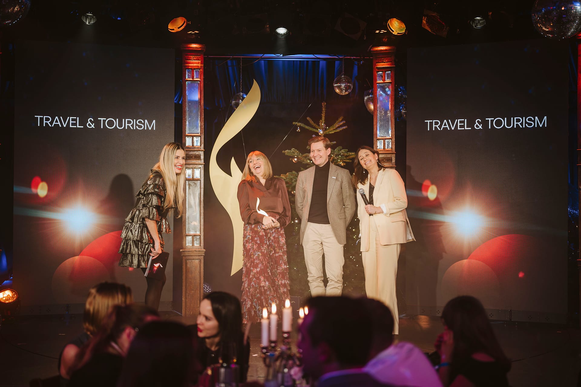 Vier Personen auf einer Bühne bei der European Excellence Awards 2025, umgeben von festlicher Dekoration und Scheinwerfer...