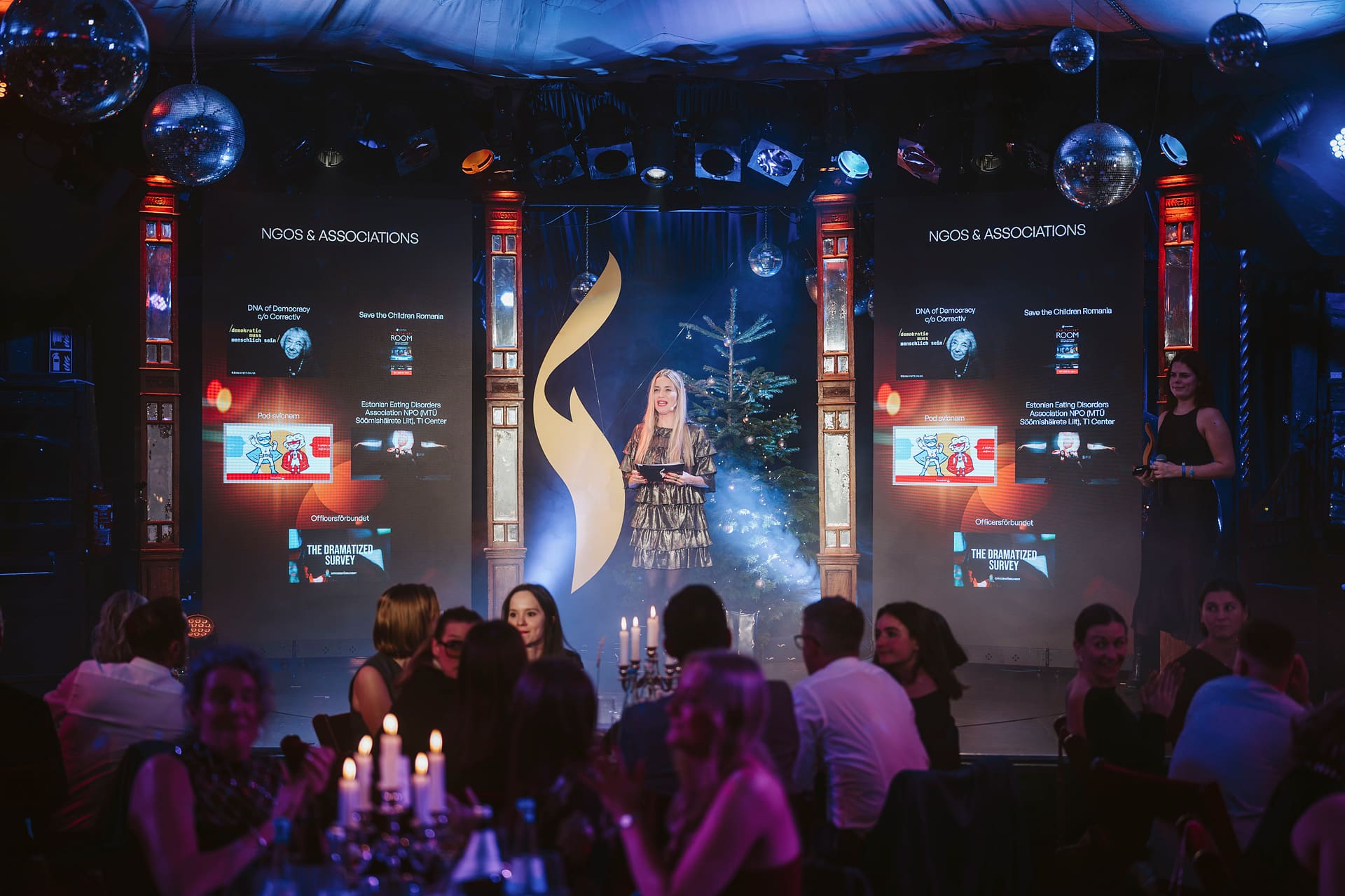 Frau auf Bühne bei der European Excellence Awards-Verleihung, Publikum sitzt an Tischen, festliche Atmosphäre mit Lichtern.