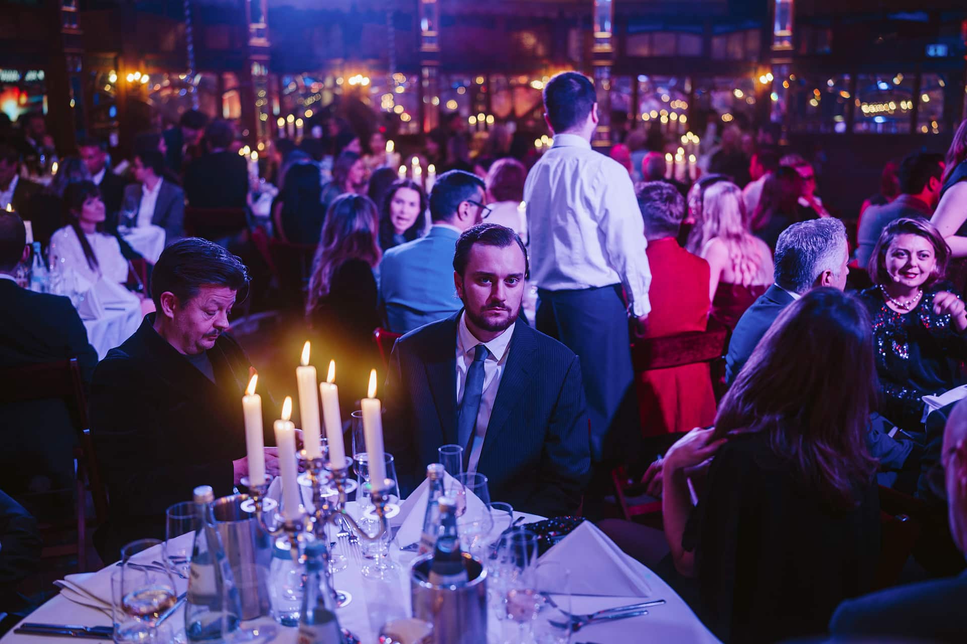Elegante Award-Show mit Gästen an festlich gedeckten Tischen, Kerzenlicht und festlicher Atmosphäre.