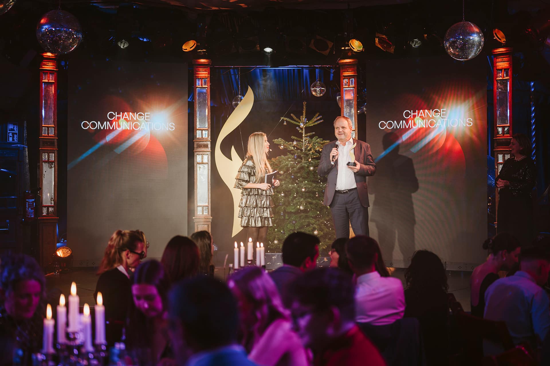 Zwei Personen auf einer Bühne bei der European Excellence Awards, umgeben von festlicher Dekoration und Publikum.