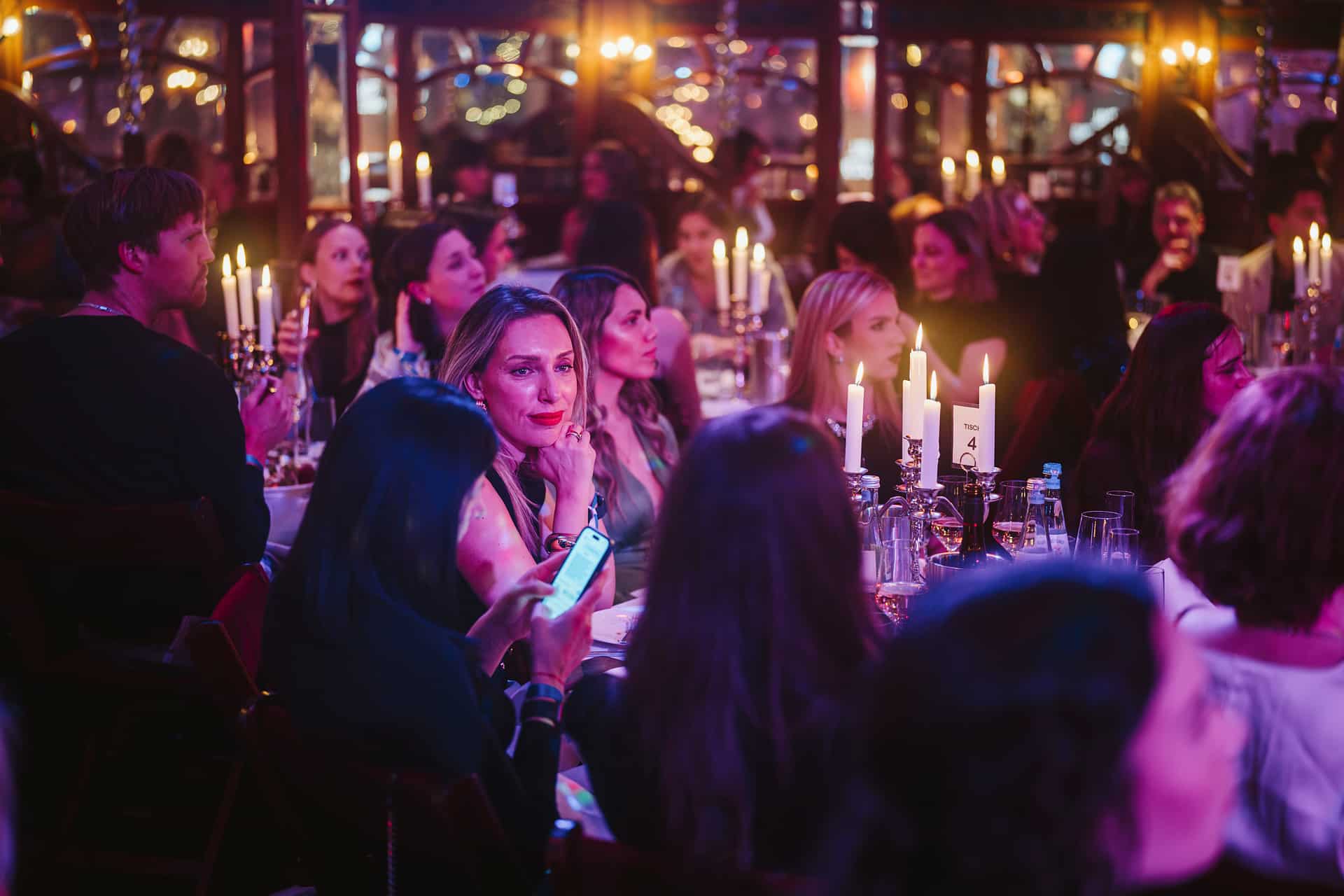 Elegante Award-Show mit Gästen, die an festlich gedeckten Tischen sitzen, umgeben von Kerzenlicht und glamouröser Atmosp...