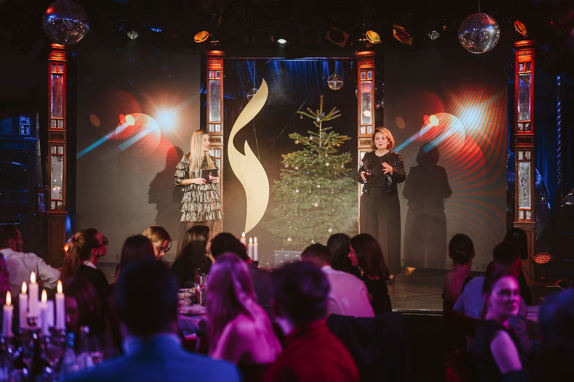Zwei Frauen auf einer Bühne bei der European Excellence Awards, umgeben von Gästen und festlicher Dekoration.