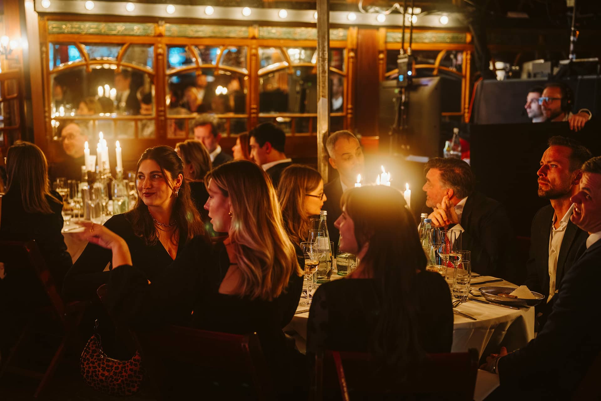 Elegante Award-Show mit Gästen an festlich gedeckten Tischen, Kerzenlicht und reflektierenden Fenstern im Hintergrund.