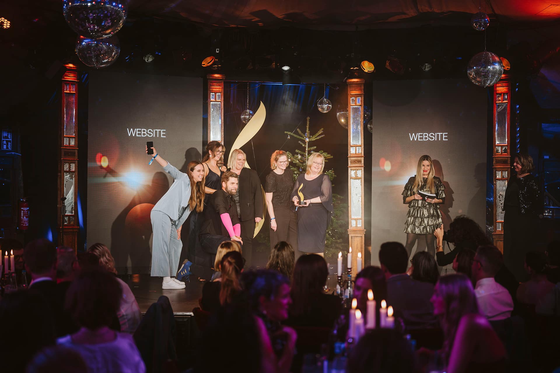 Gruppe von Menschen auf der Bühne bei der European Excellence Awards-Verleihung, umgeben von Lichtern und Publikum.