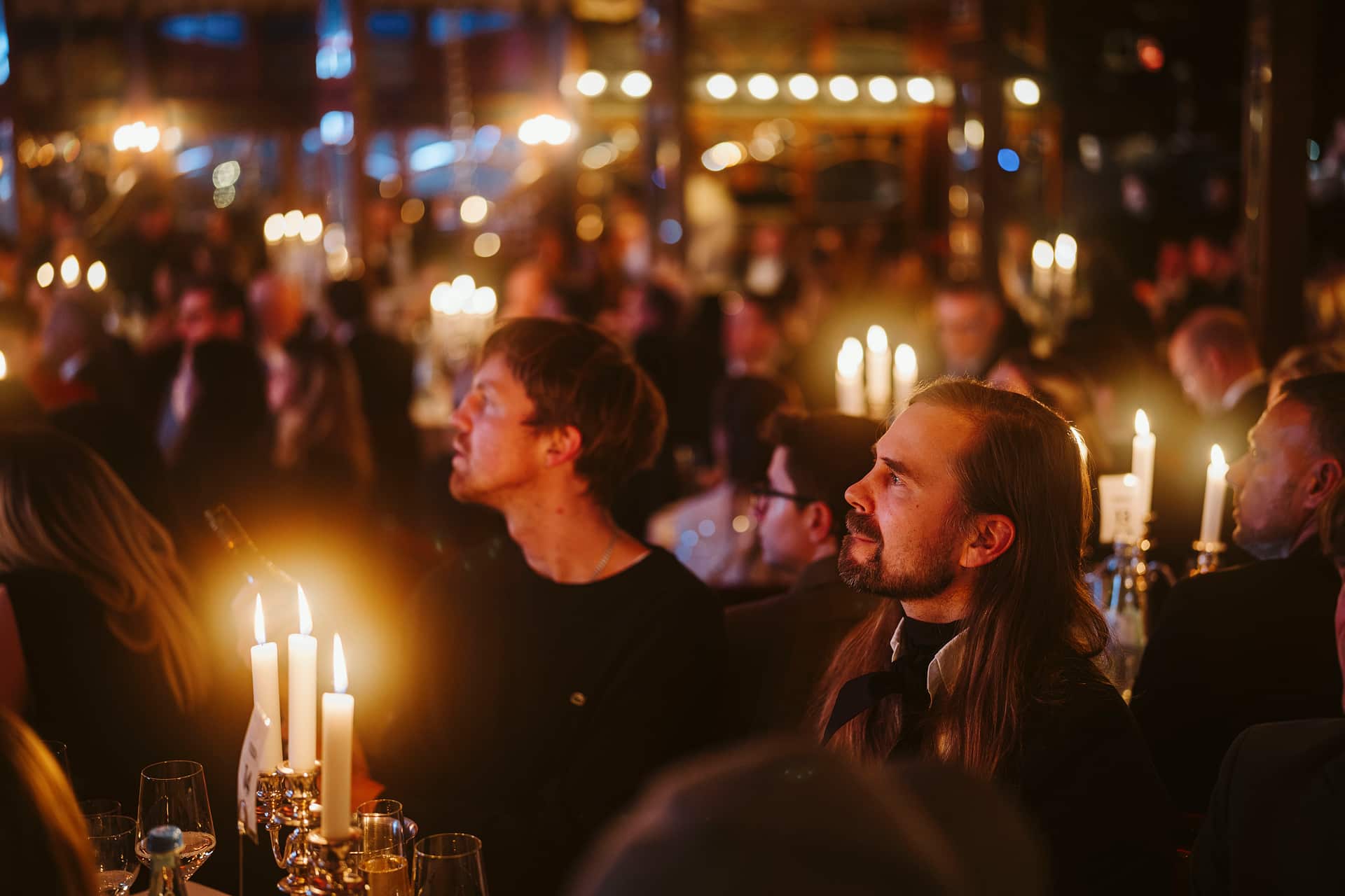 Menschen in eleganter Kleidung sitzen an einem Tisch, umgeben von Kerzenlicht, während sie einer Preisverleihung zuschauen.