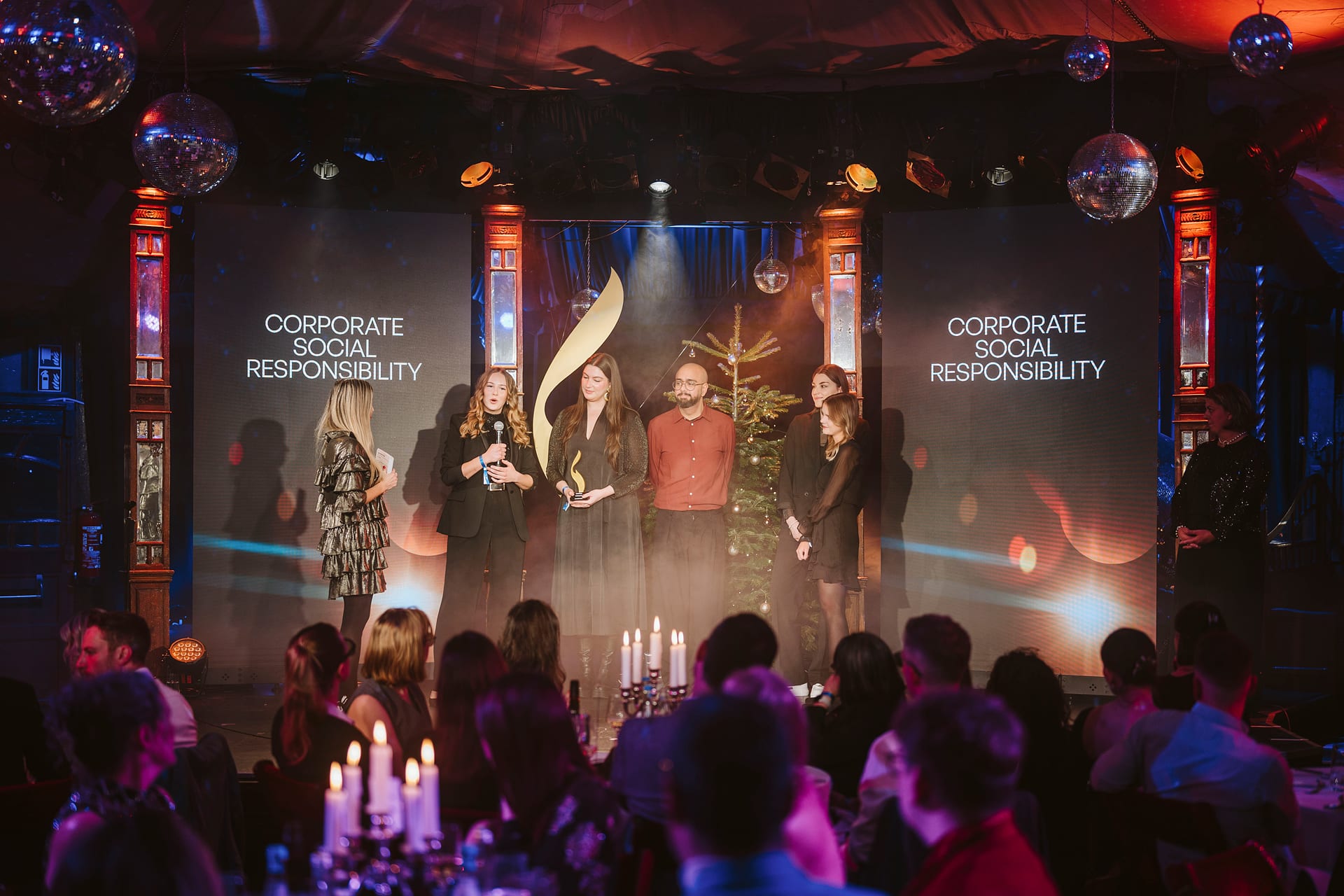 Zwei Frauen und ein Mann nehmen einen Preis für soziale Verantwortung auf einer Bühne entgegen, umgeben von Publikum und...
