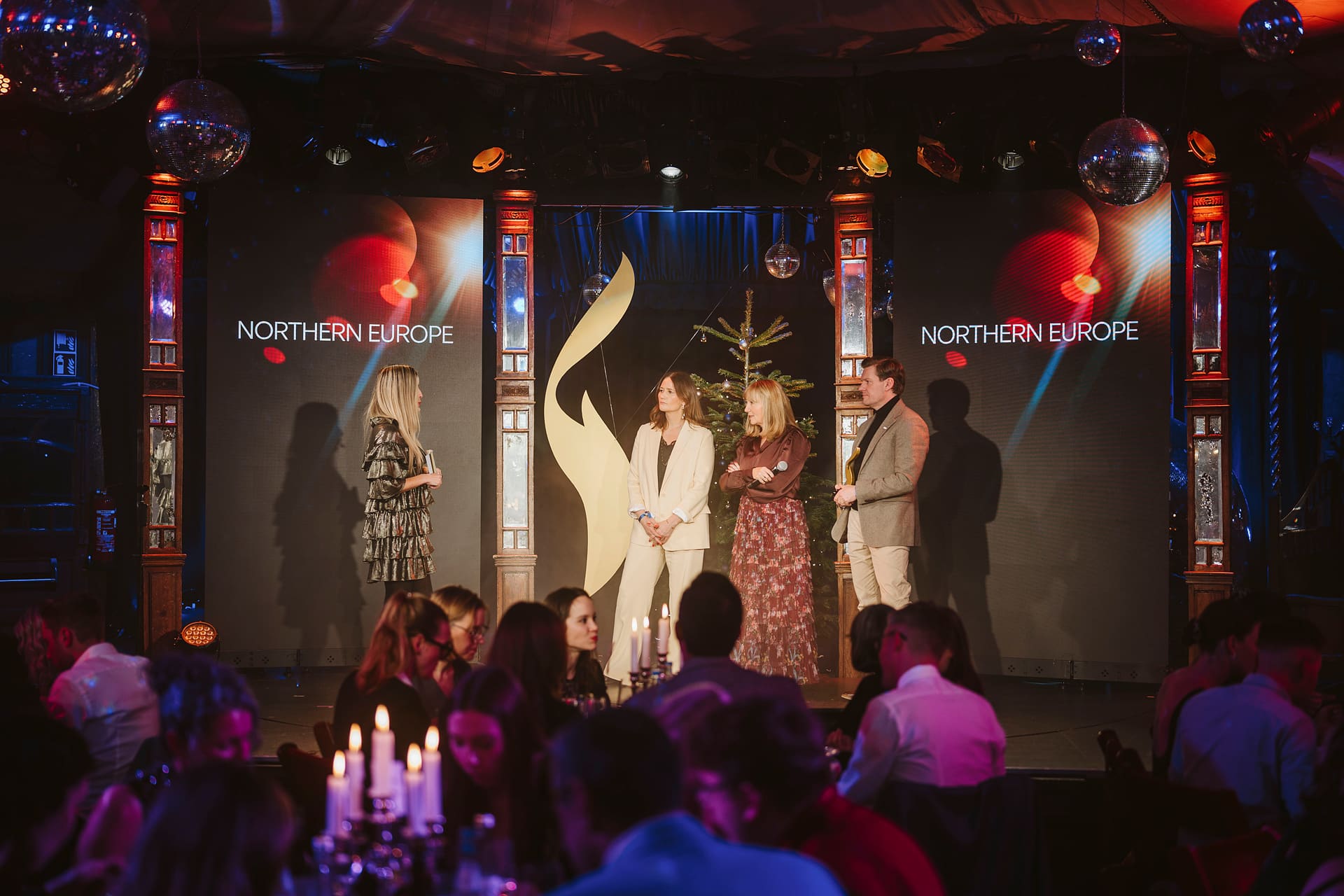 Drei Personen auf der Bühne bei den European Excellence Awards, umgeben von festlicher Dekoration und Publikum.