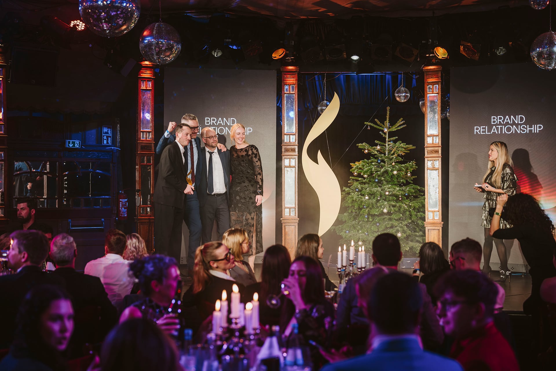 Preisverleihung mit Gästen, einer Bühne, einem Weihnachtsbaum und einer großen Auszeichnungsskulptur im Hintergrund.