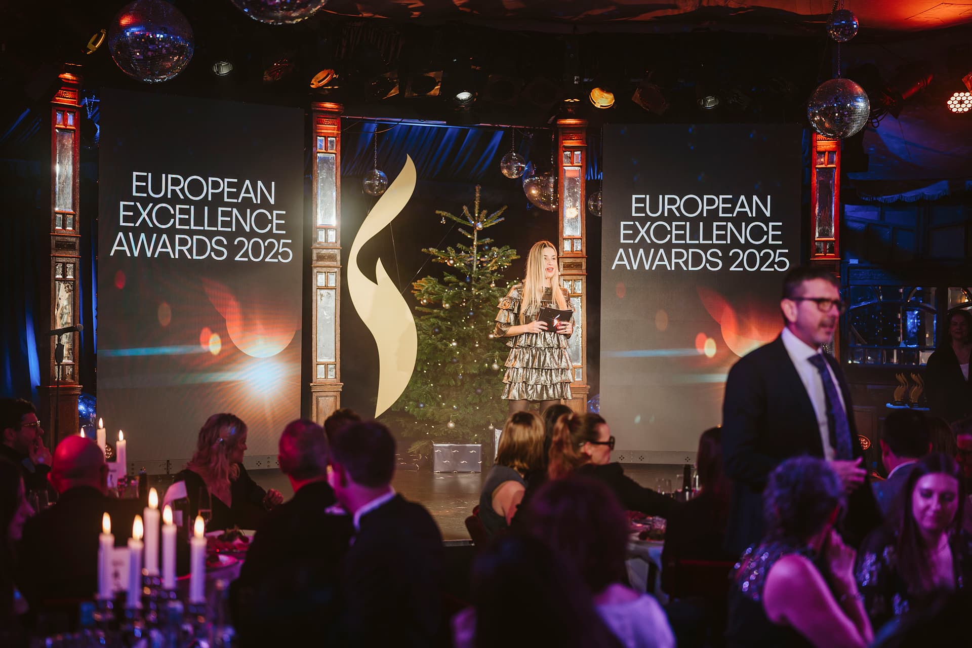 Frau auf Bühne bei den European Excellence Awards 2025, umgeben von festlicher Dekoration und Publikum.