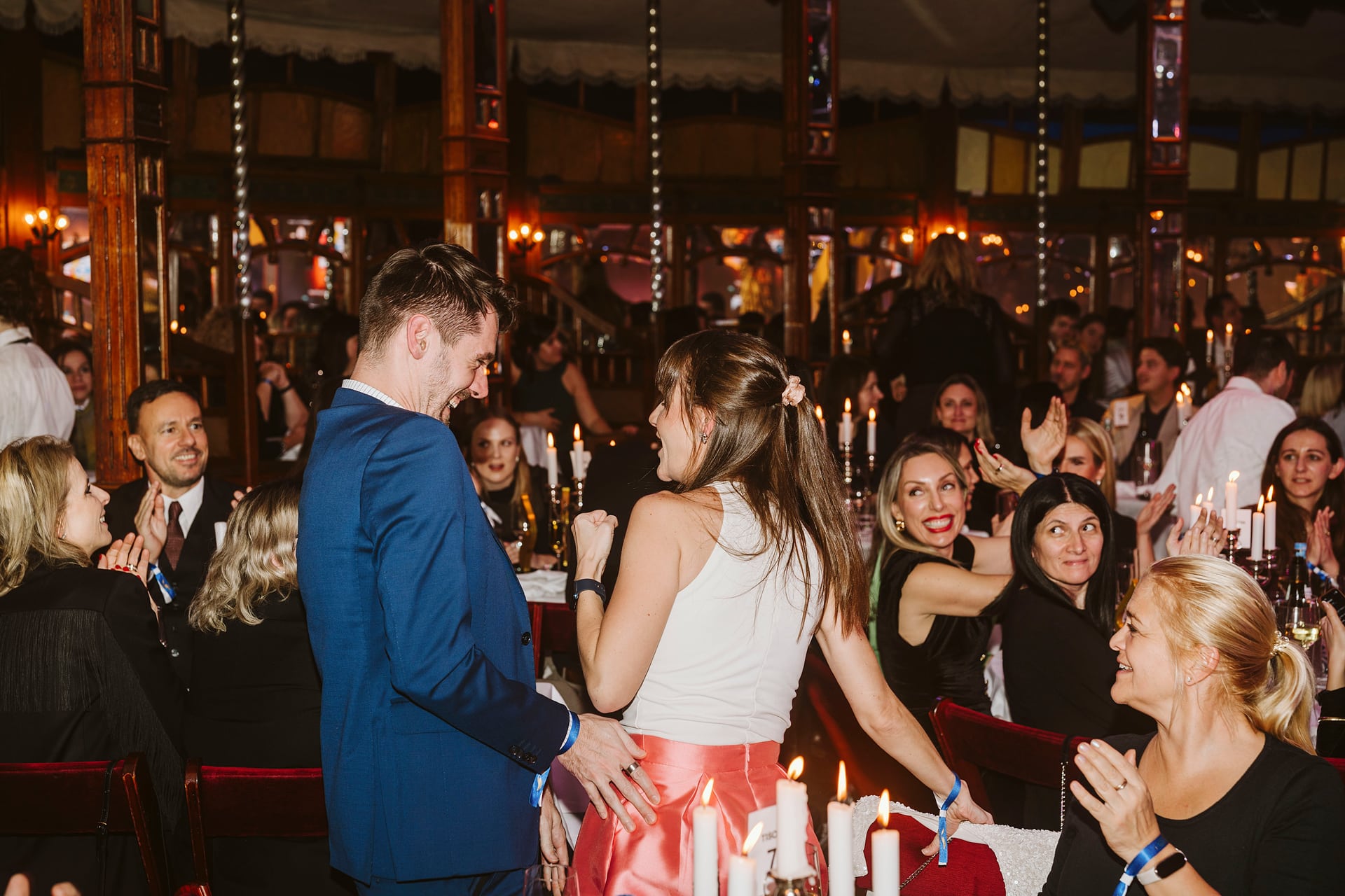 Zwei Personen in eleganter Kleidung interagieren bei einer festlichen Award-Show, umgeben von applaudierenden Gästen.