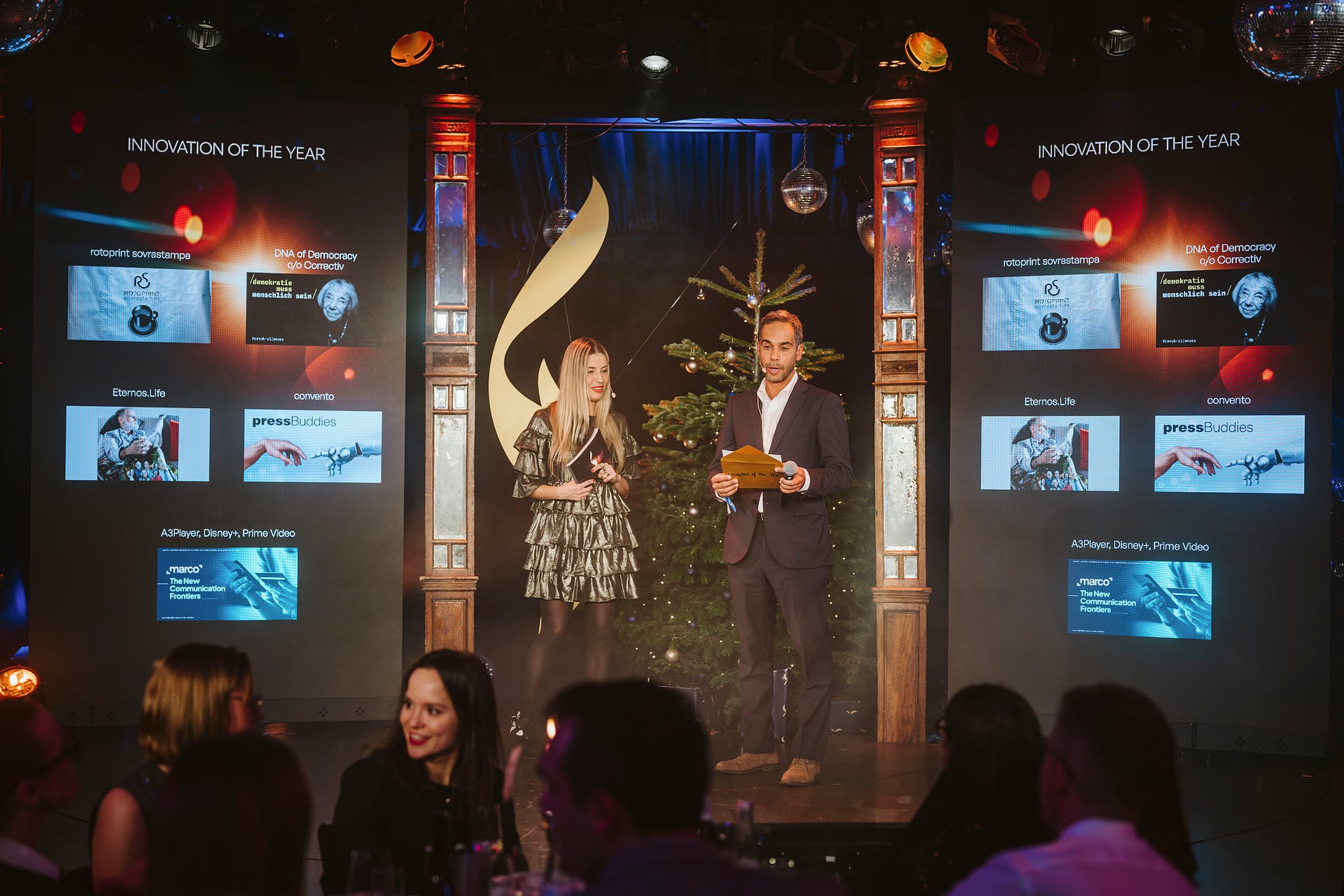 Moderatoren präsentieren die European Excellence Awards auf einer Bühne mit Bildschirmen und festlicher Dekoration.