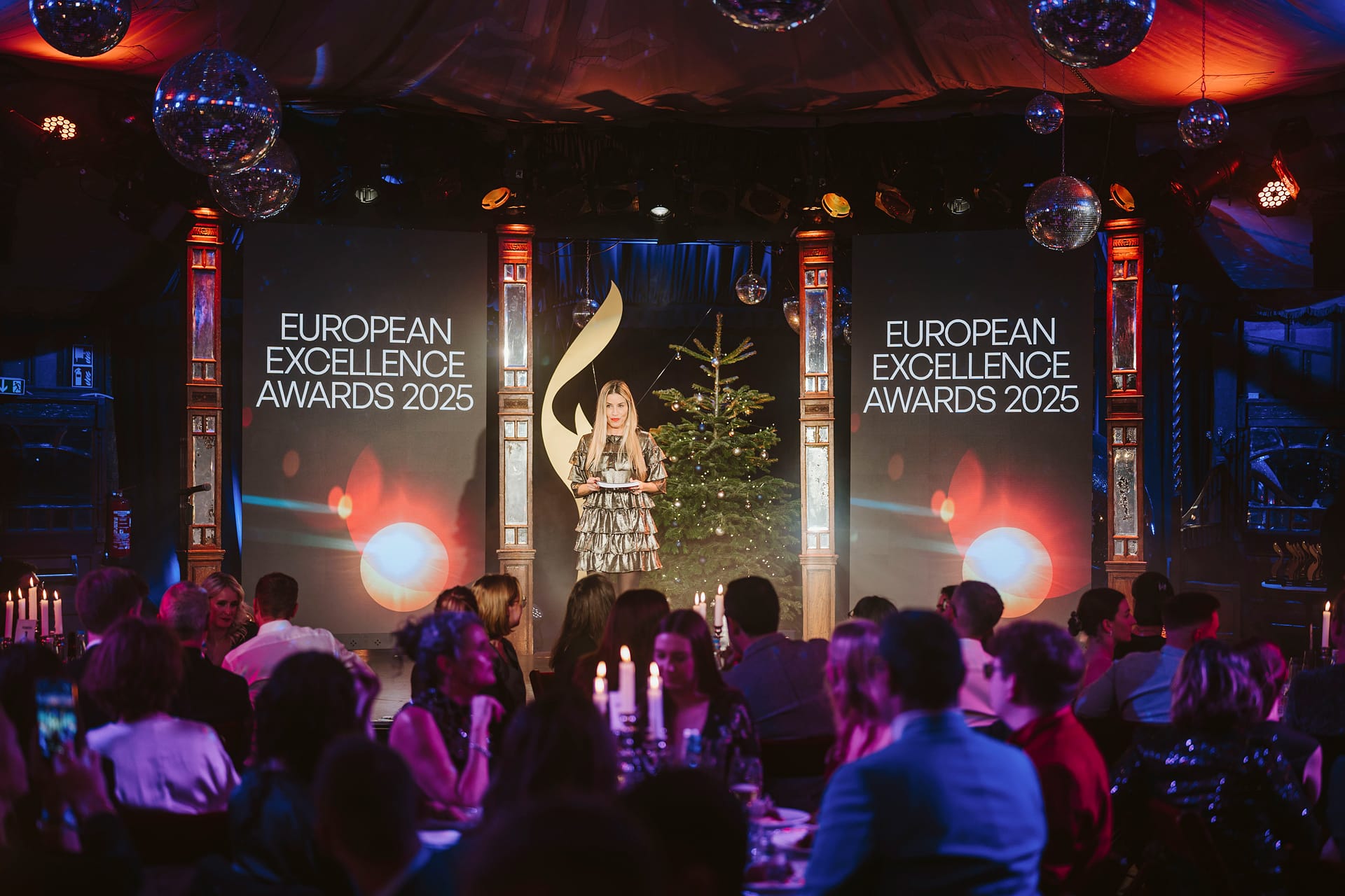Frau präsentiert auf einer Bühne die European Excellence Awards 2025, umgeben von festlicher Dekoration und Publikum.
