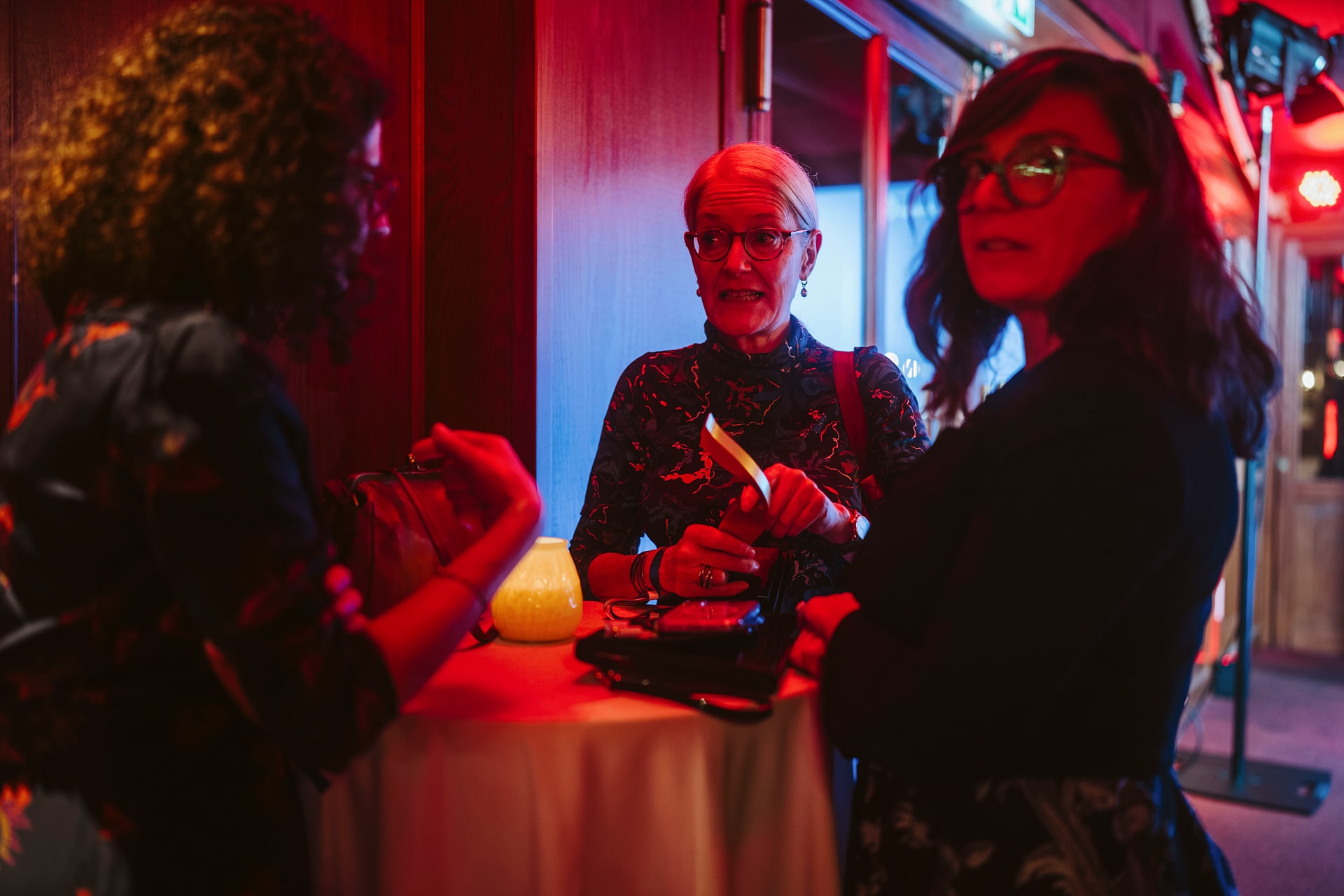 Drei Frauen in eleganter Kleidung unterhalten sich an einem Stehtisch in einem festlich beleuchteten Raum.