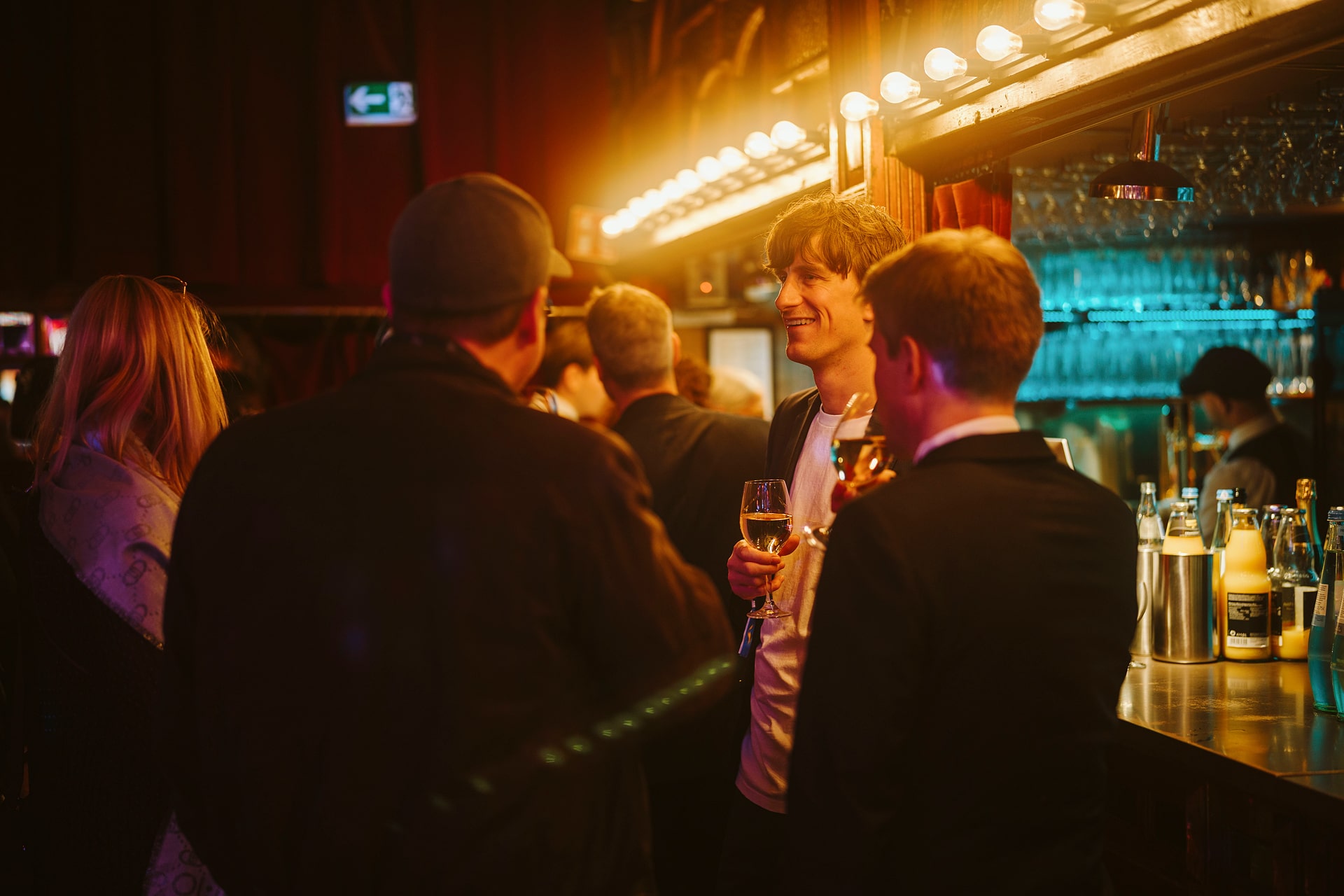 Menschen in eleganter Kleidung unterhalten sich bei der European Excellence Awards Veranstaltung, mit Gläsern in der Hand.