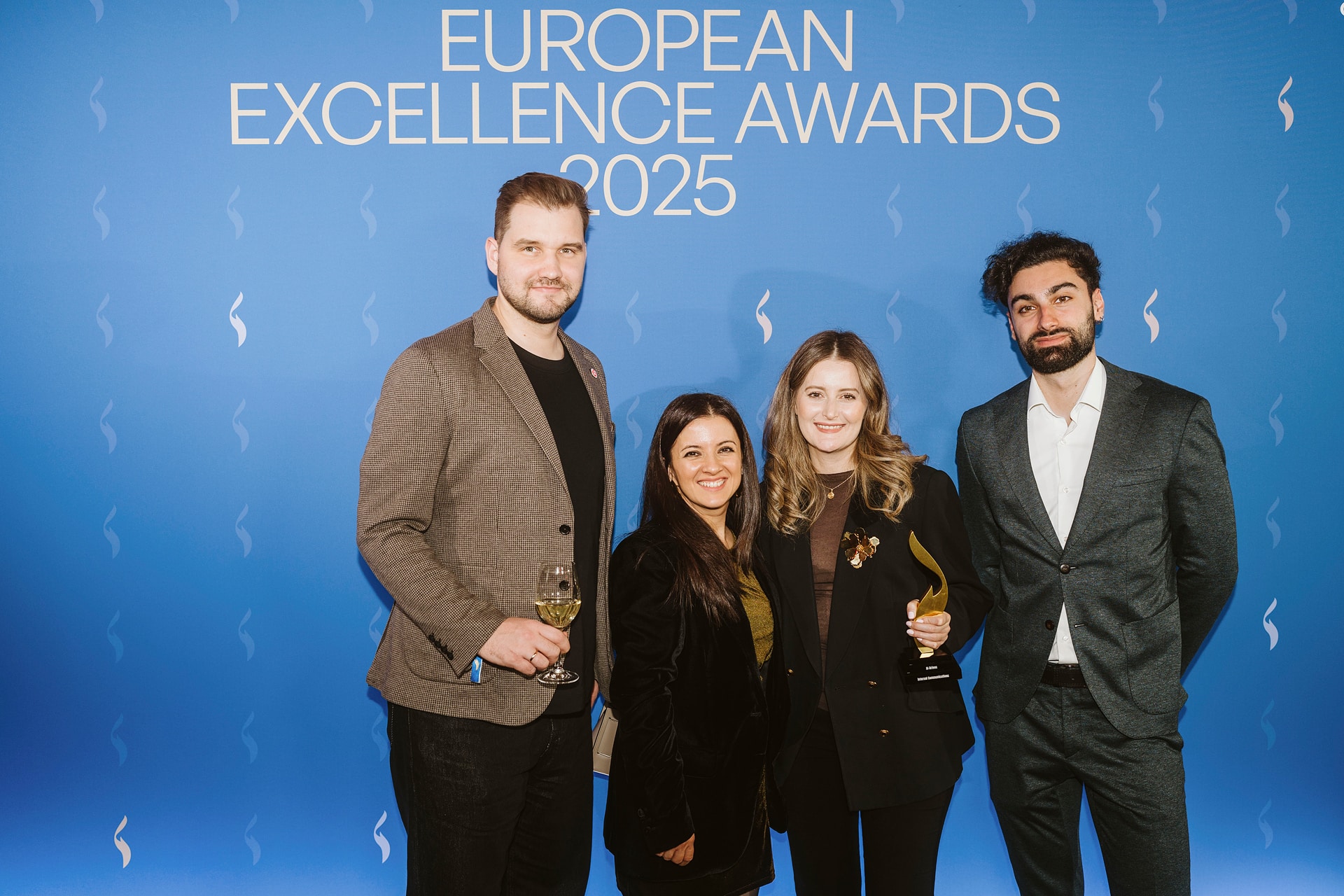 Vier Personen posieren mit einem Award vor einem blauen Hintergrund mit dem Text "European Excellence Awards 2025".