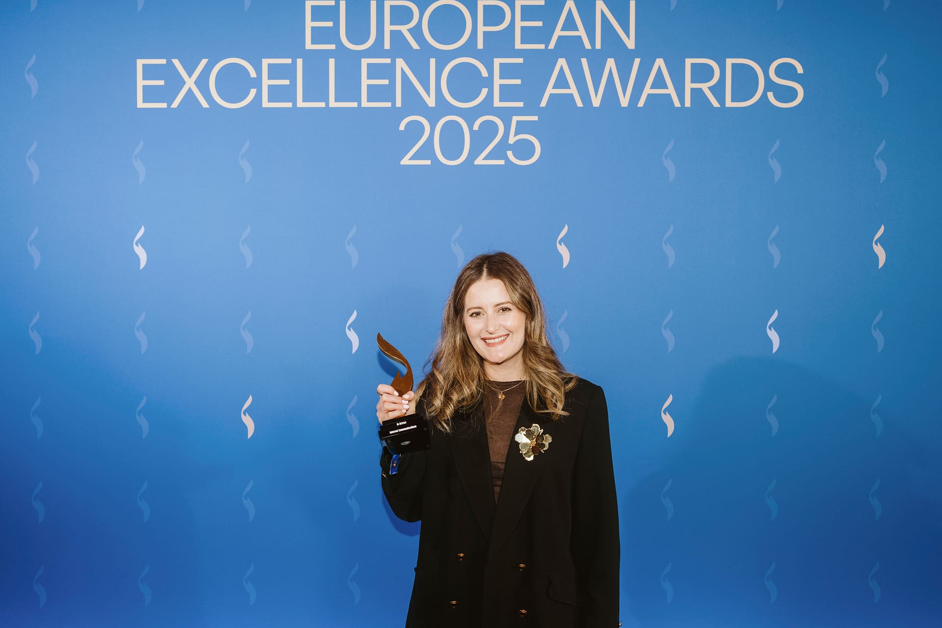 Frau in schwarzem Blazer hält einen Preis vor einer blauen Wand mit dem Text "European Excellence Awards 2025".