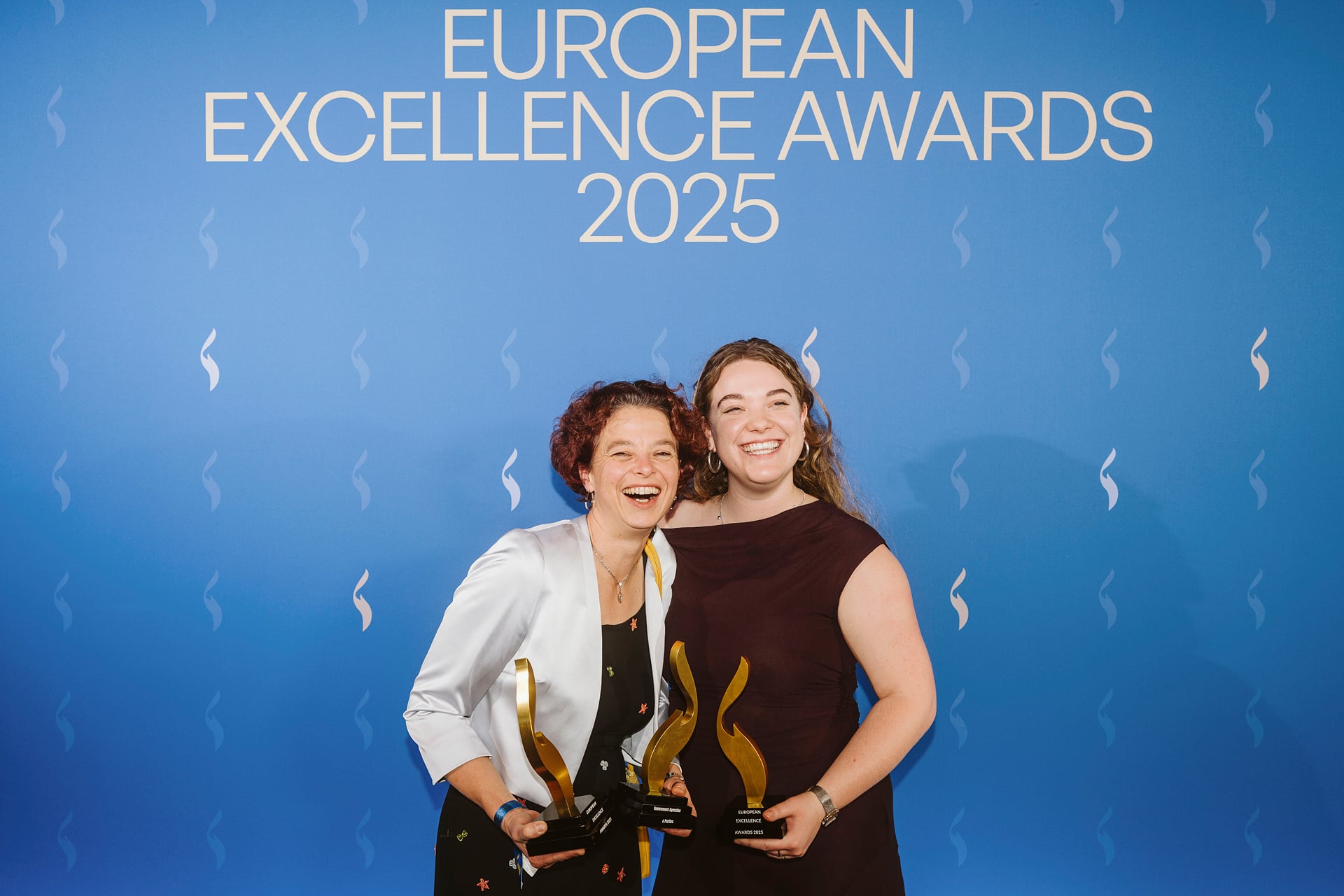 Zwei Frauen lächeln, halten Trophäen vor einem blauen Hintergrund mit dem Text "European Excellence Awards 2025".