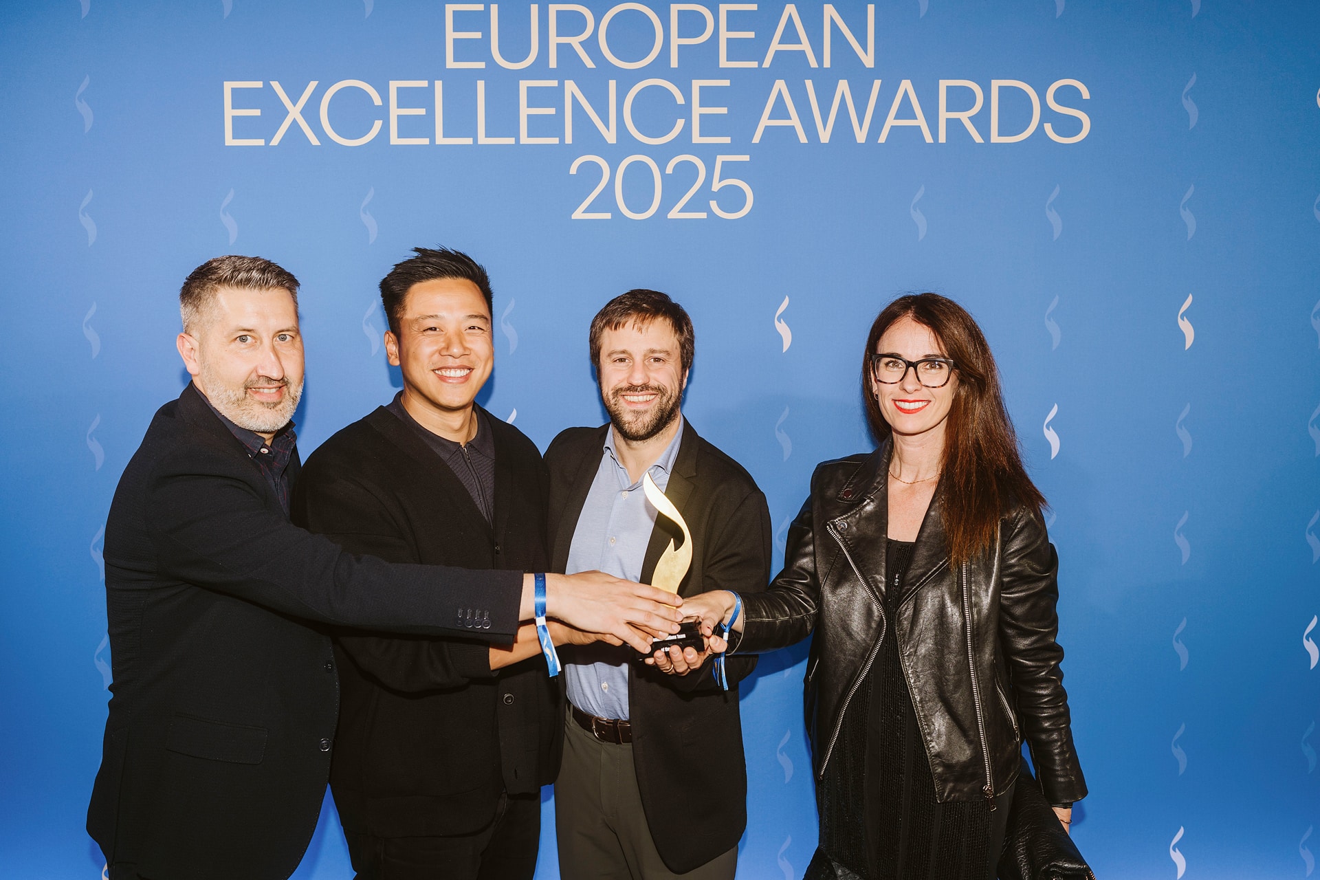 Vier Personen halten einen Preis vor einem blauen Hintergrund mit dem Text "European Excellence Awards 2025".