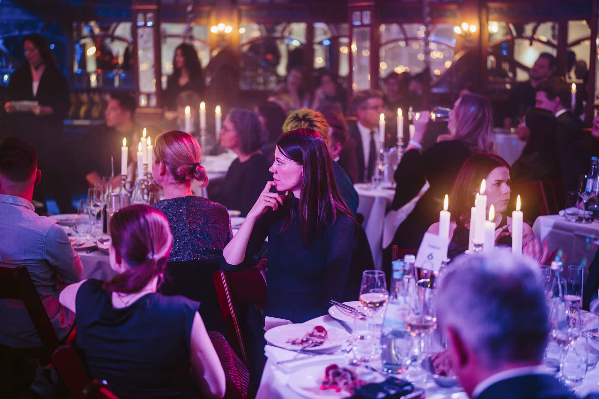 Elegante Award-Show mit Gästen an festlich gedeckten Tischen, Kerzenlicht und festlicher Atmosphäre.