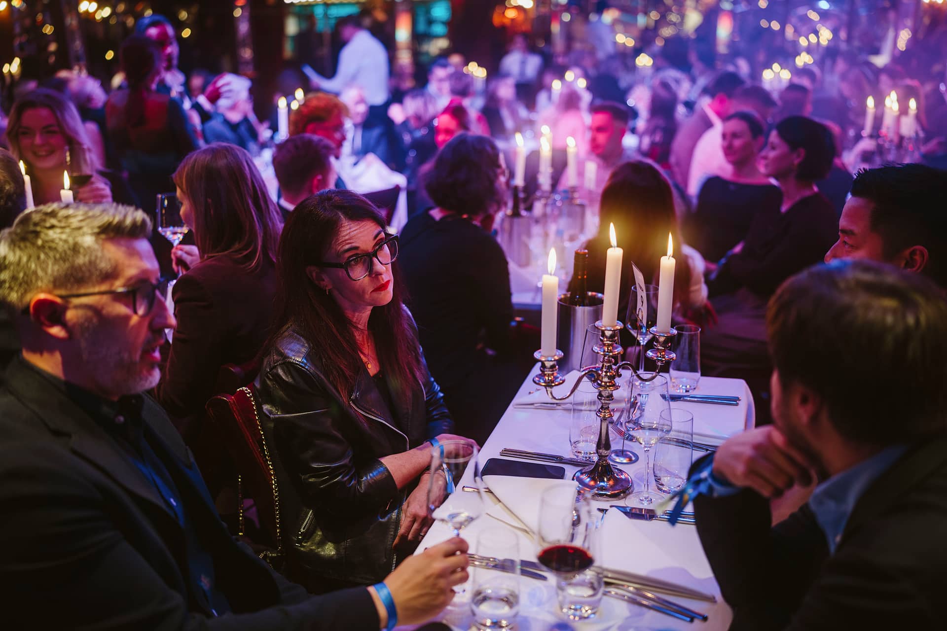 Elegante Award-Show mit Gästen an festlich gedeckten Tischen, Kerzenlicht und festlicher Atmosphäre.