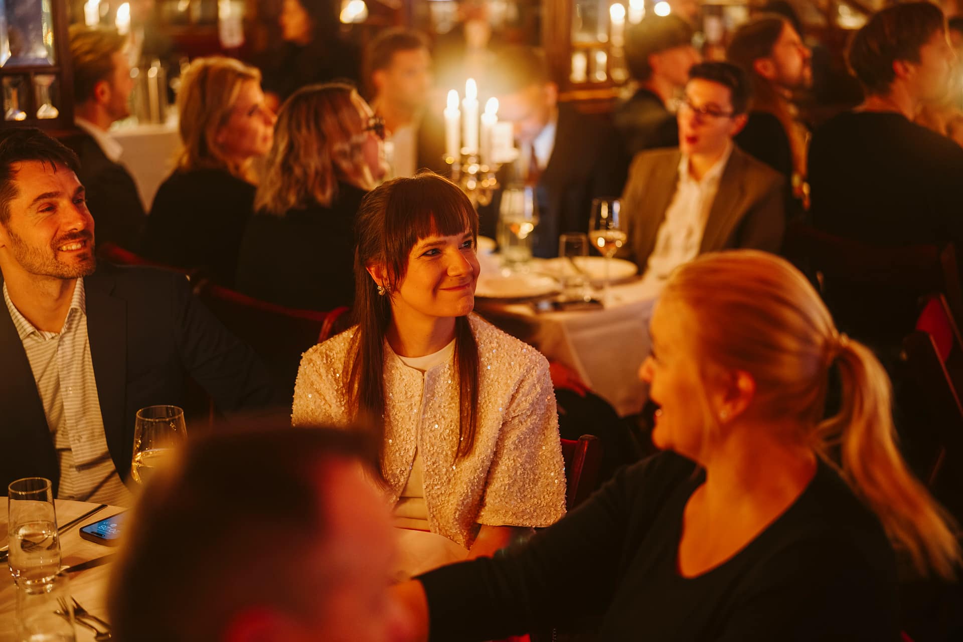 Gäste bei der European Excellence Awards Gala, lächelnd und in festlicher Atmosphäre, mit Kerzenlicht und eleganter Kle...