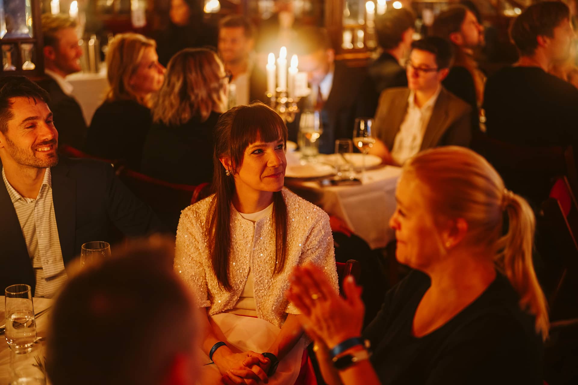 Gäste bei der European Excellence Awards Gala, elegant gekleidet, sitzen an festlich gedeckten Tischen in gedämpftem Licht.
