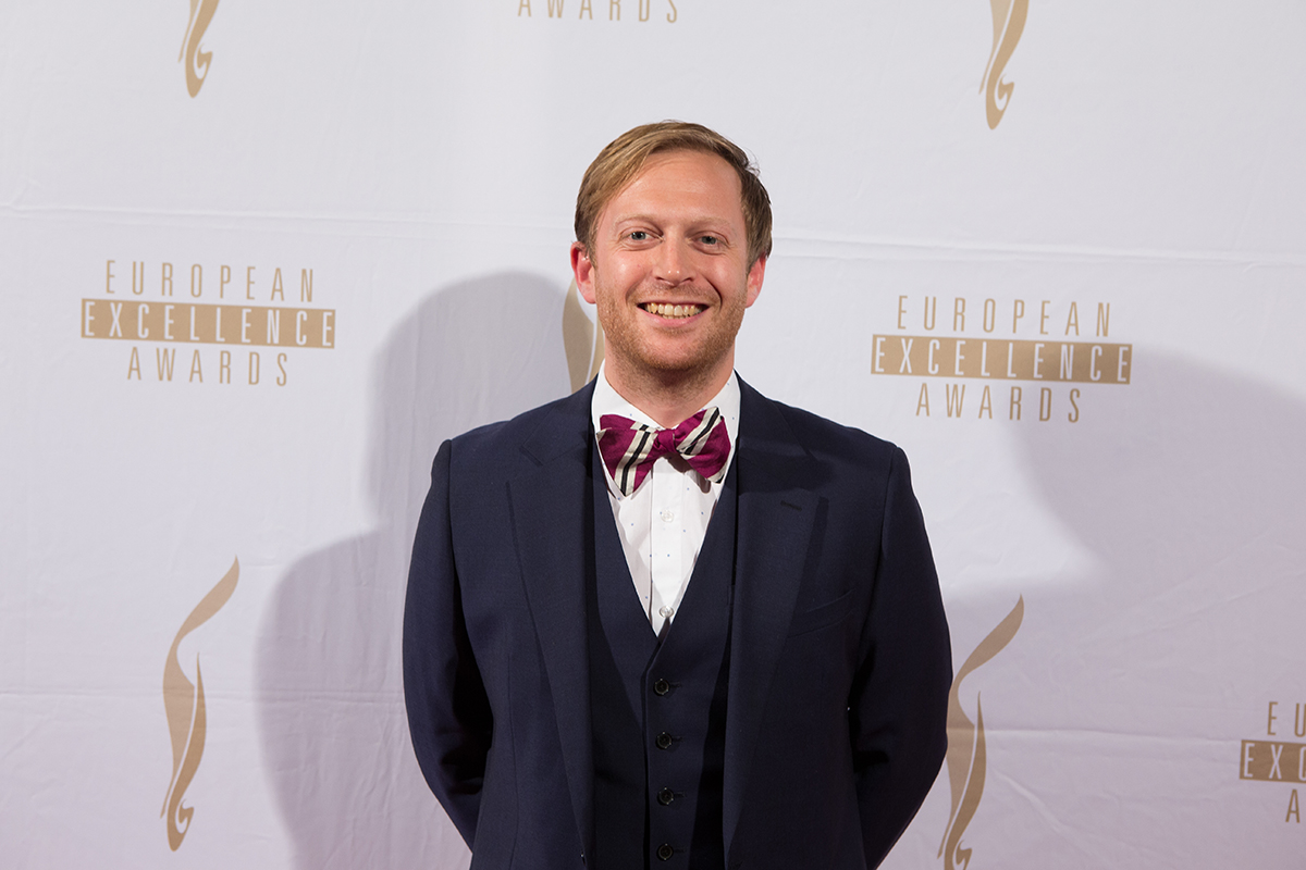 Mann in Anzug mit Fliege lächelt vor einem Hintergrund mit dem Schriftzug "European Excellence Awards".