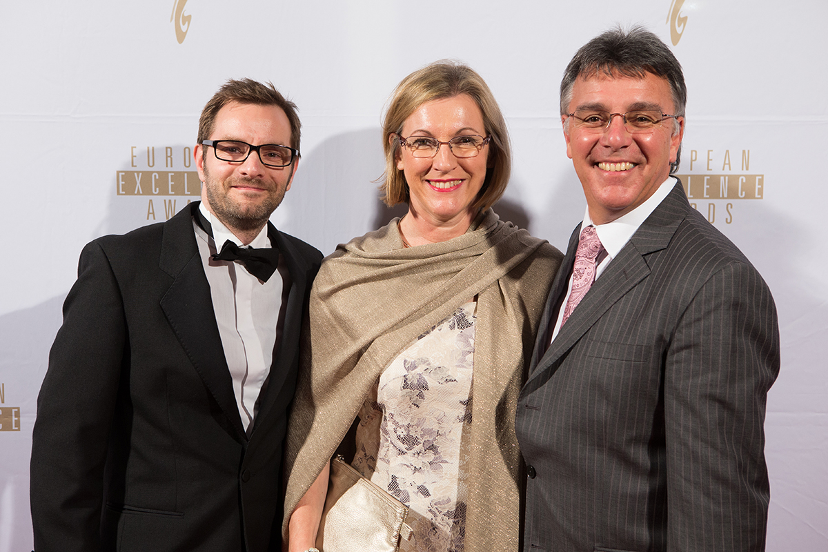 Drei Personen in formeller Kleidung posieren vor einem Banner mit dem Text "European Excellence Awards".