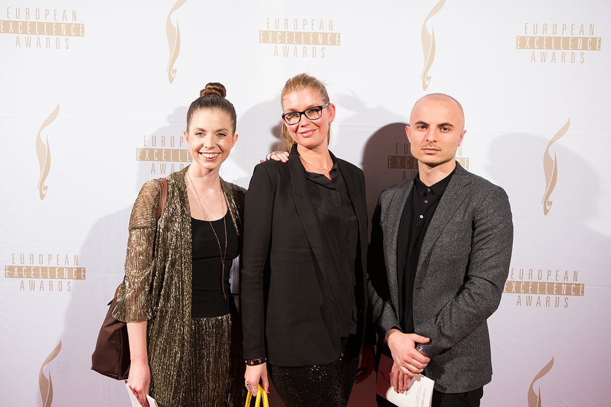 Drei Personen posieren vor einer Wand mit dem Schriftzug "European Excellence Awards".