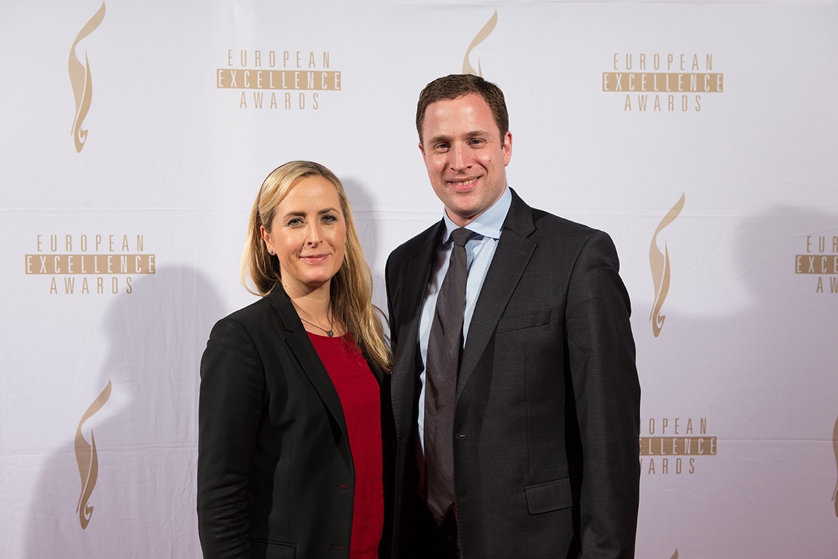 Zwei Personen posieren vor einem Banner der European Excellence Awards. Die Frau trägt ein rotes Oberteil, der Mann einen...