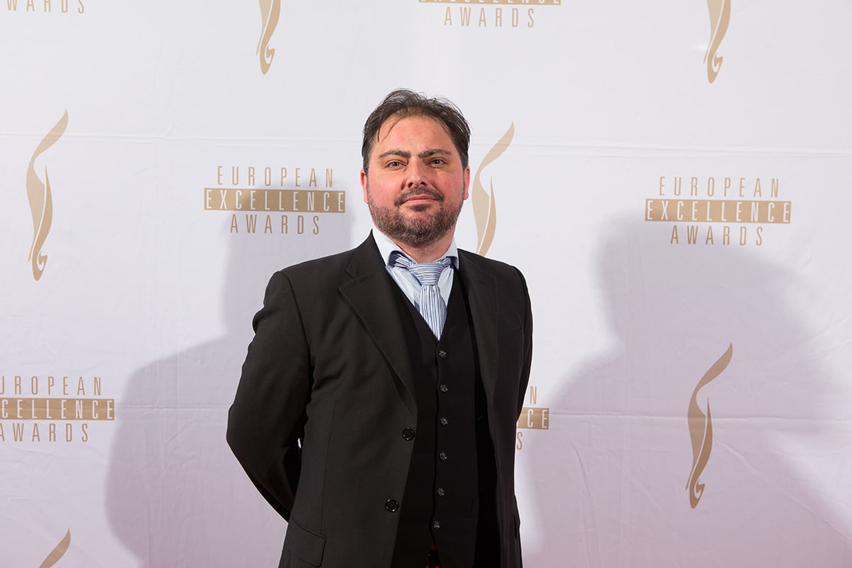 Mann in Anzug steht vor einer Wand mit dem Schriftzug "European Excellence Awards".