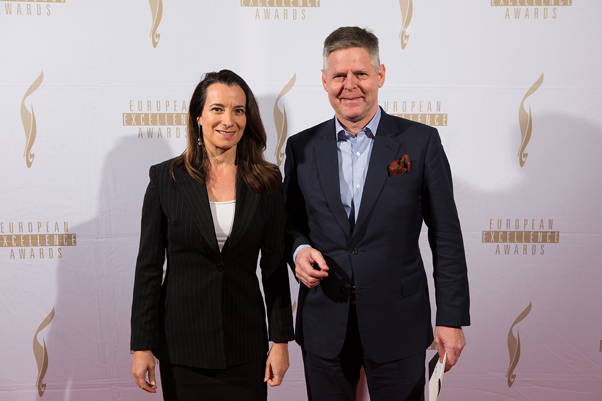 Zwei Personen in formeller Kleidung posieren vor einem Banner der European Excellence Awards.